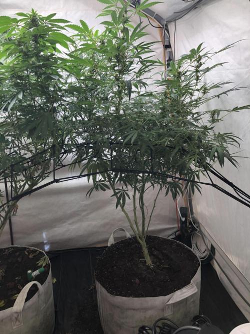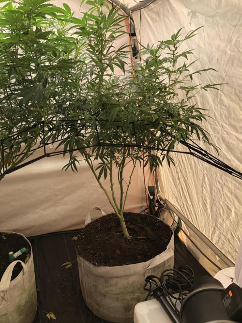 MindFlowers68 Shes still just hanging out vegging along slowly. The net is looking mostly filled but still space to run branches if needed as they fill it. Got a feeding if compost tea once this week. Temps have dropped and humidity is in a more acceptable range and the load on the plants has been dropped for the time being so not much input needed on my part. I need to clean up the lowers a bit and think about if I'm going to bother trying to get a bigger pot around the roots somehow.