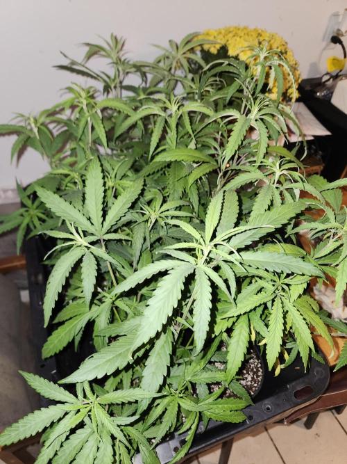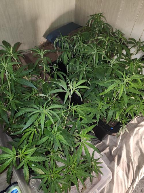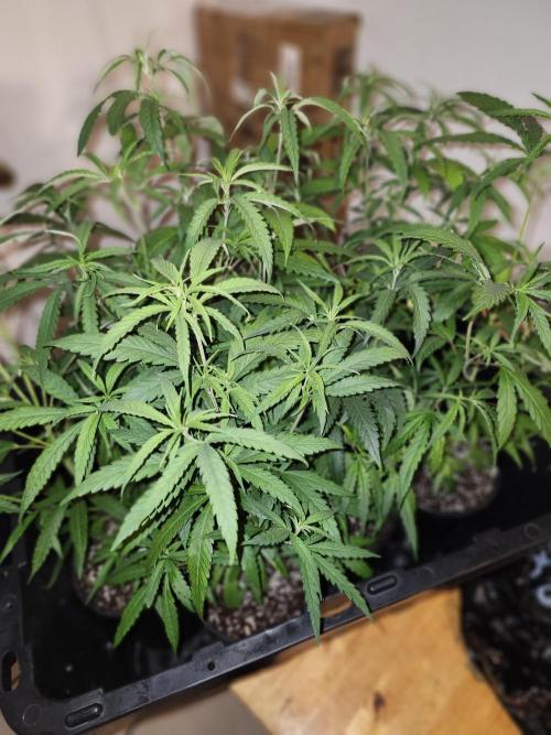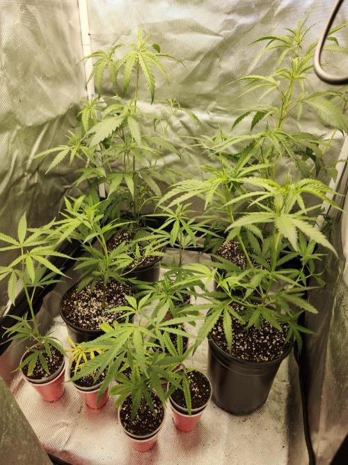 GREENPHOENIX6262 09/29 - Mother has been flipped into flower - first 11 clones transplanted into 1 gallon pots - baby set of 10 still in prop dome. I will be alternating between mother and clones for diary submission.