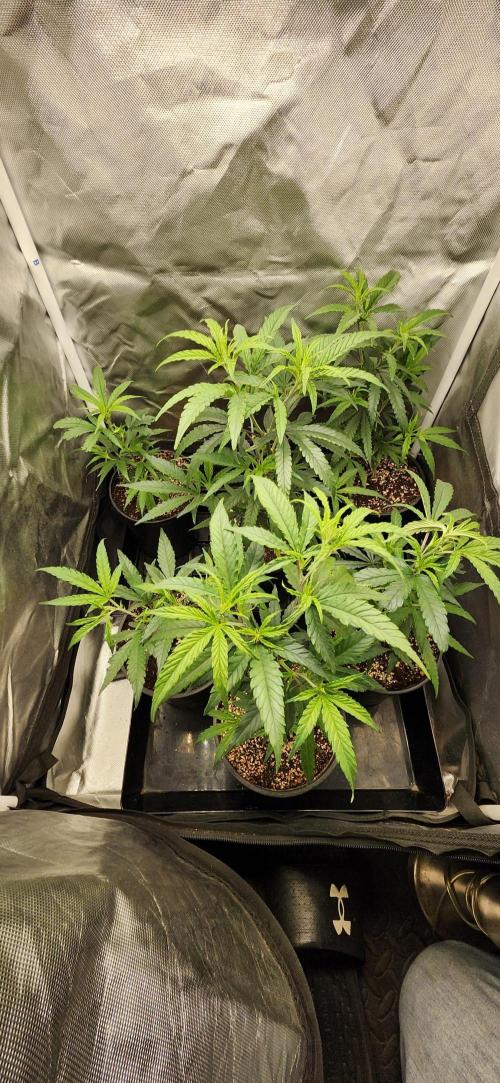 GREENPHOENIX6262 Coming up on week 5 (Veg) she has been rocking well, Light nute feed and added a humidifier temps 84 Humidity 83 - looking to transplant this mother very soon 08/01 - Closing up week 5 - 13 inches (5 inches in one week) tied down main A steams - prepping for cloning - topped side branches - micro dose feeding ( Silica. Nitro, Super Thrive, Cal-Mag)