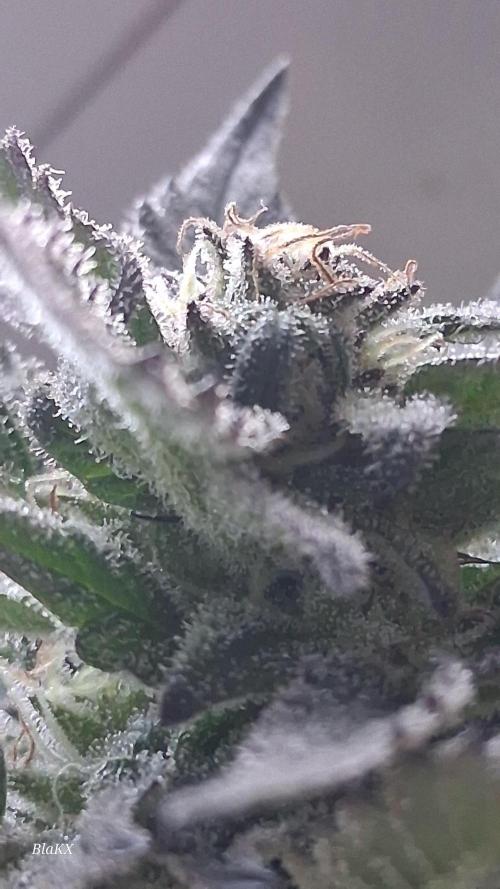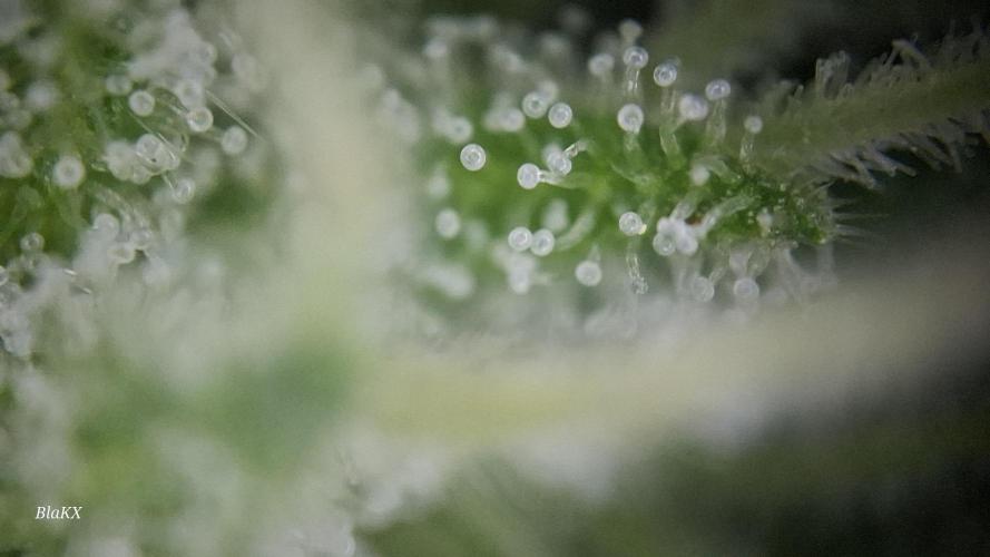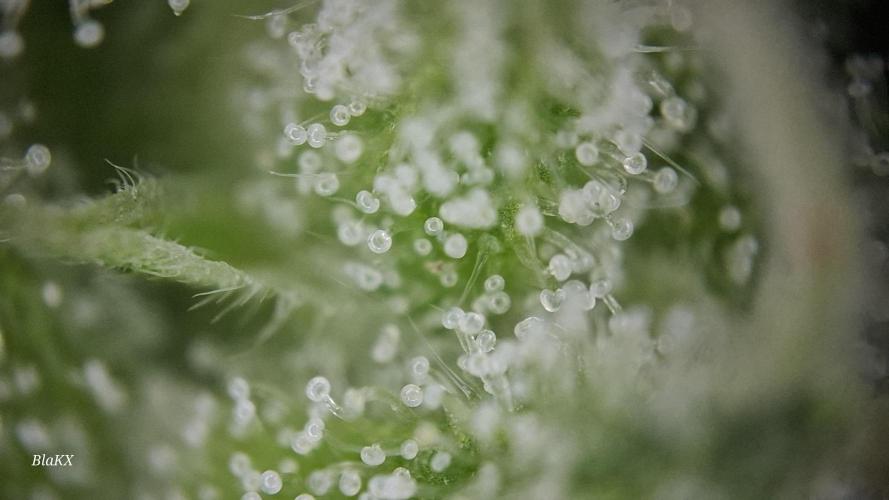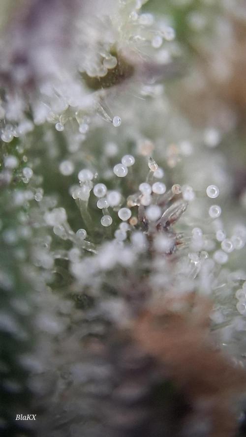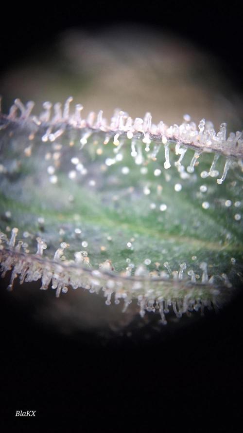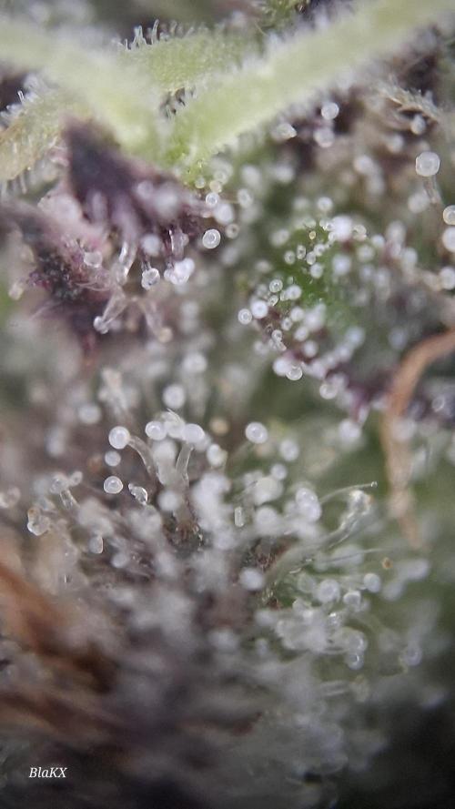 Die letzten 3 wochen waren konstant verregnet und bewölkt. Trotzdem hat sie ordentlichen Harz bessatz so das ich Zuckerblätter an den kleinen Kompakten Blüten lasse und nach dem trocken entferne. Wie man an den microscope Bildern erkennen kann sind alle Trichomen Milichig und vereinzelt Bernsteine und liegt damit in der angeben Blüte Zeit.