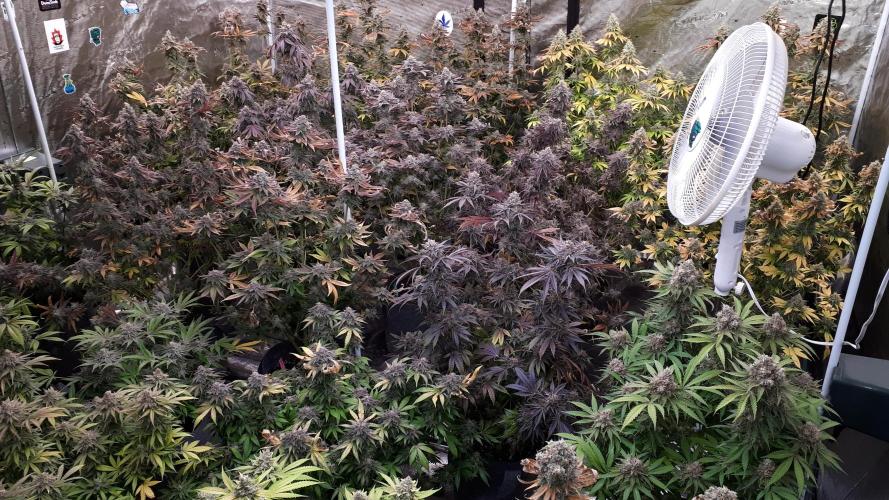 DID A MAJOR DEFOLIATION TO HELP CONTROL THE HUMIDITY AND MORE LIGHT PENETRATION. WHEN YOU REMOVE AS MUCH LEAF AS I DO, YOU GET WAYYY MORE BUDS BUT THEY ARE SMALLER BUT IT HELPS LOWER THE HUMIDITY VERY WELL
