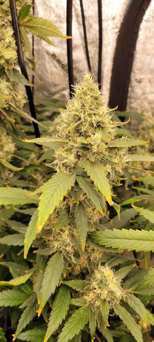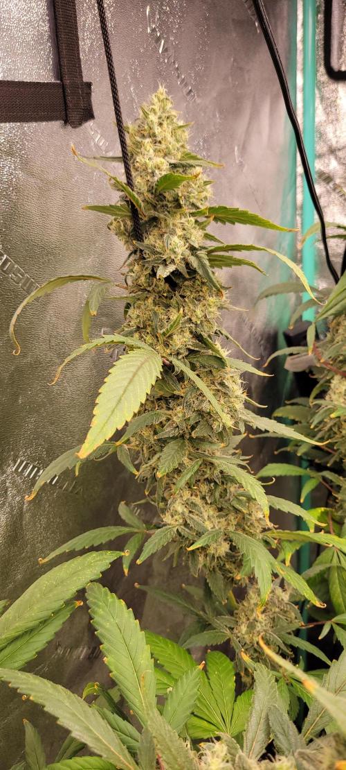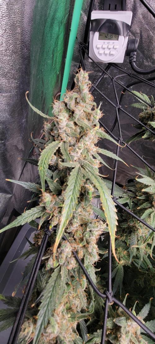 Stonerandgrower One left of three :)) the short one i got 7.3 ounces dry the one that looks weird was 5lbs wet and 17 dry and the one that's left has the biggest buds of them alll but I've got my neice staying and I can't harvest again for atleast another week