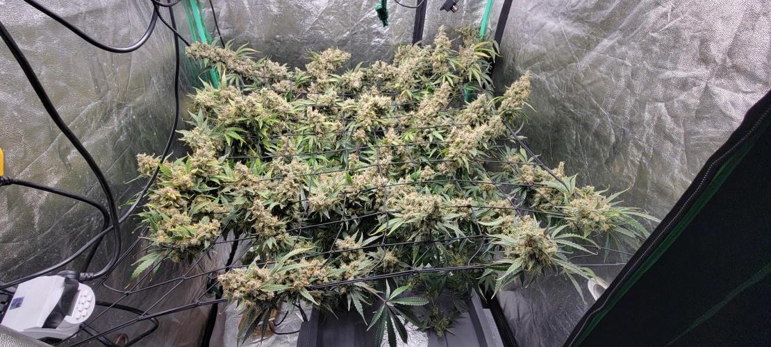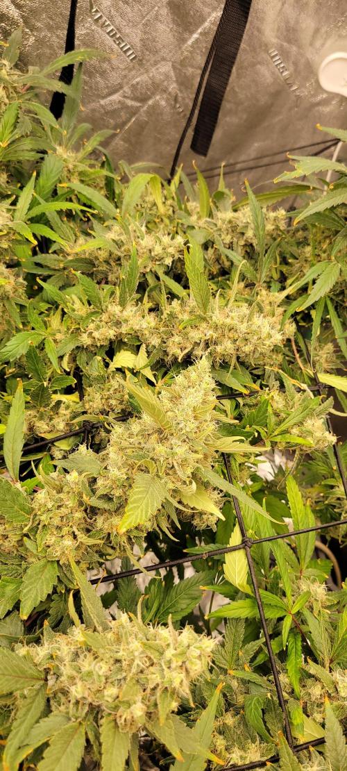 Stonerandgrower I harvested the short one today. It weighed 2.5 pounds wet and the buds next to the tissue box is 19 inches of solid bud and it's a side bud lol it's crazy they're the biggest buds I've ever had and the bud that's laying on the net is 23 inches from top to bottom. Alsoo sorry I haven't been actively keeping things updated then just coming and posting 10 pics and talking a ton but yeah :)