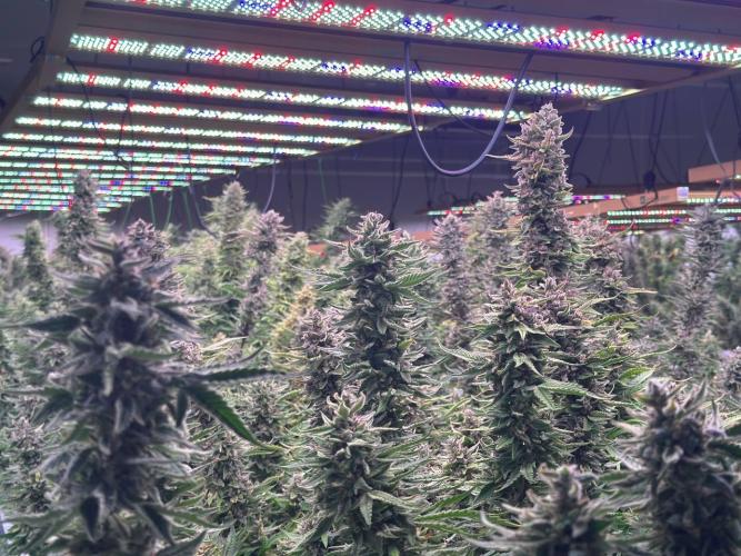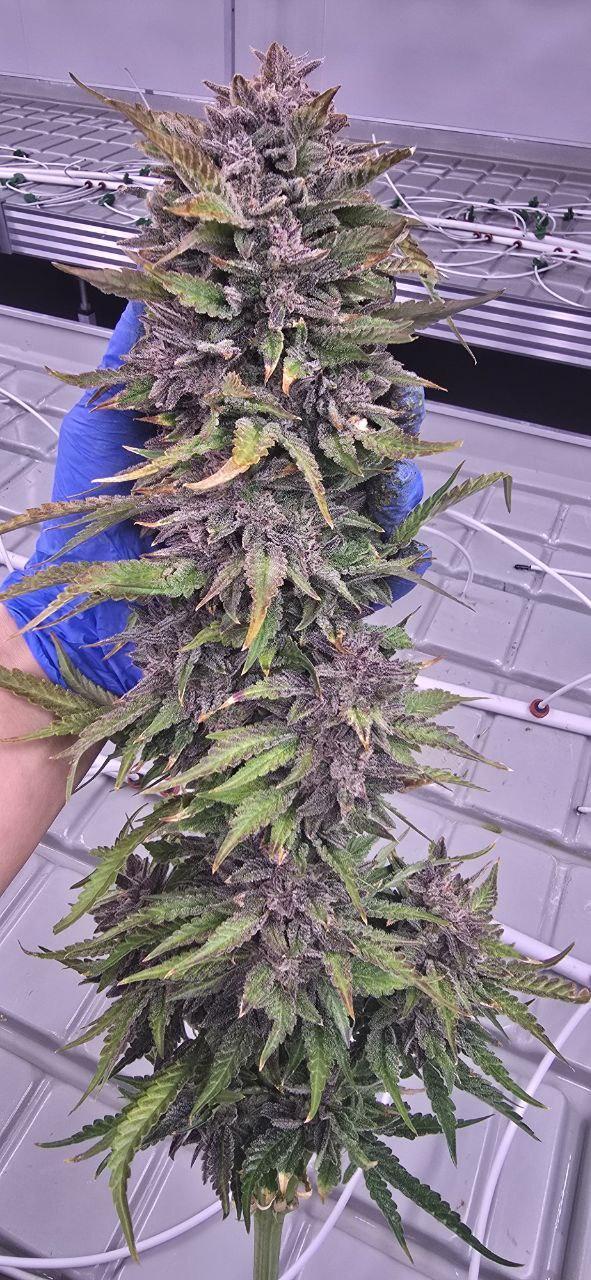 IceGenetics Today, day 88. Plant height 130–160 cm. Over 8 days, the inflorescences have swollen even more. Nutrient concentration — 850 ppm, room temperature daytime up to 26 °C, nighttime up to 22 °C, CO2 concentration about 900 ppm, humidity — 40%. The light schedule is 18 hours of light and 6 hours of darkness. PPFD — 750.
