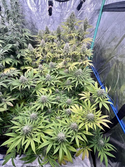 BostonGirlGrows Just past the 4th week mark in flower. Plants have received a few feeds now with green sensation. I have not been phing my feeds, but am now that there’s another additive. Hopefully that will sort out the yellowing that’s happening- specifically on the back plant. In the next few days I’ll pull everyone out, clean up the leaves that are dry and shriveled under the canopy and do a quick anatomy check.