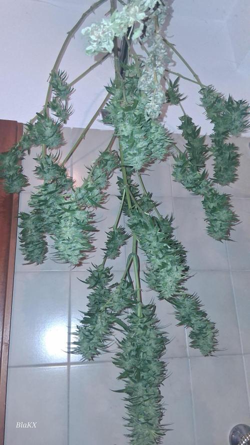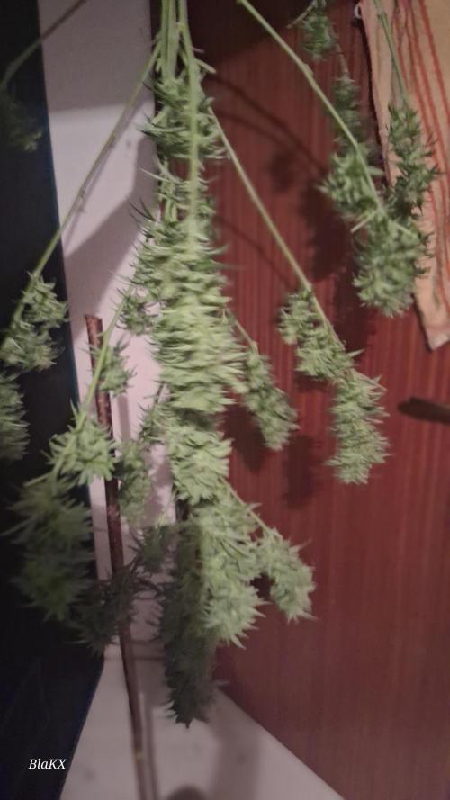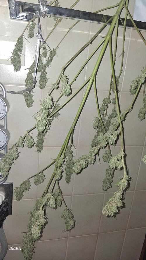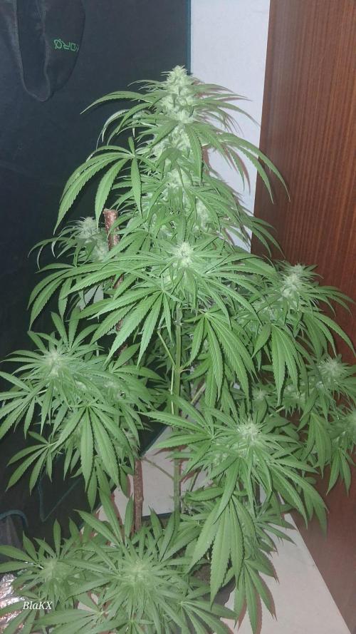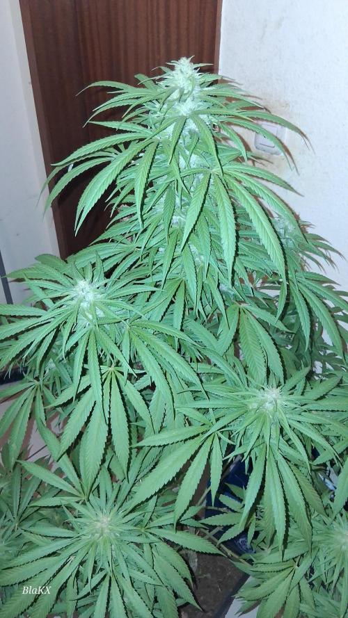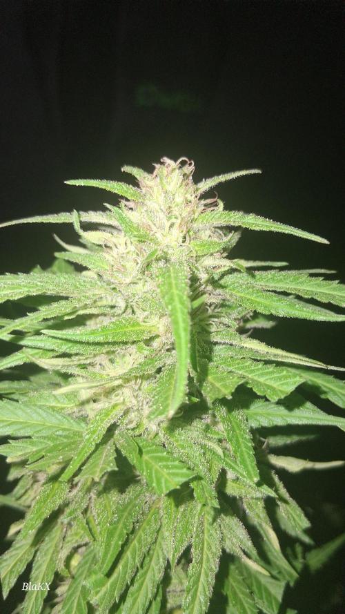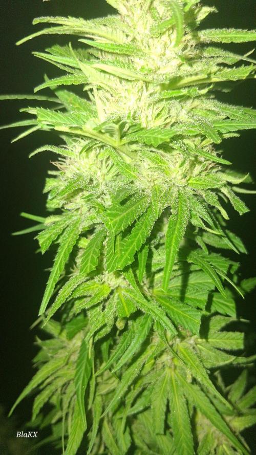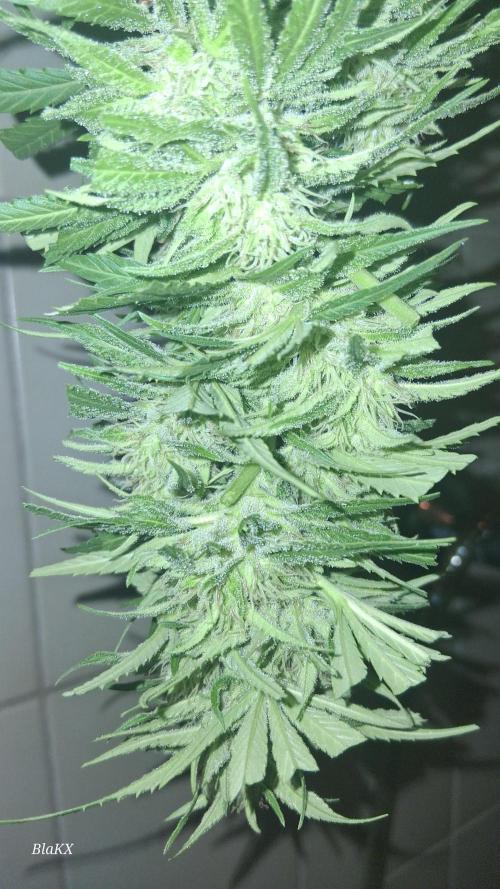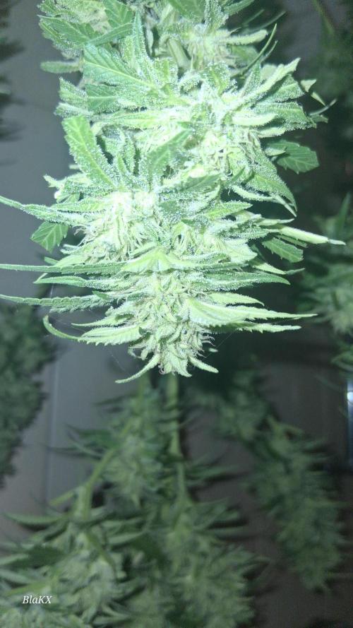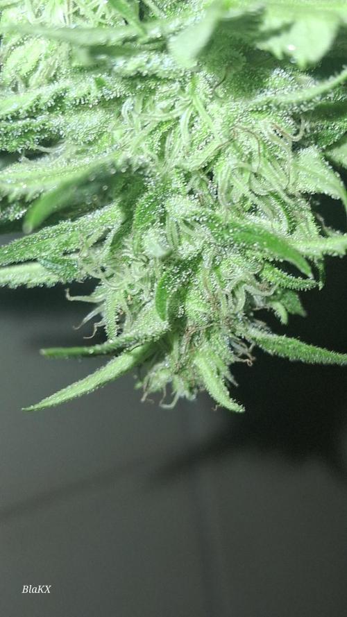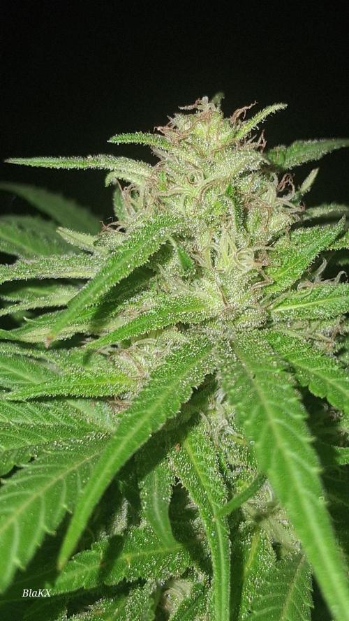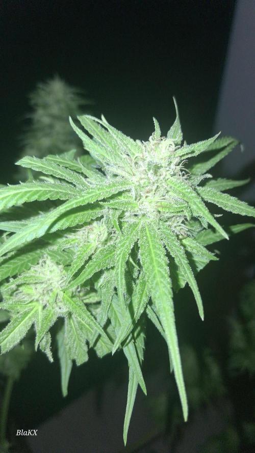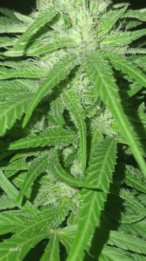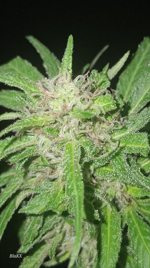 BlaKX High Growmies, Dieser tester blüht extrem langsam im vergleich mit Der A version und der Zombie Kush wo noch draußen stehen. Sieht aber eher danach aus als wenn der strain definitiv nicht fertig wird bei den wenigen sonnen Stunden. Habe sie deswegen noch mal entlaubt und unnötigen balast weg geschnitten das sie sich rein auf ihre Krone konzentrieren kann.