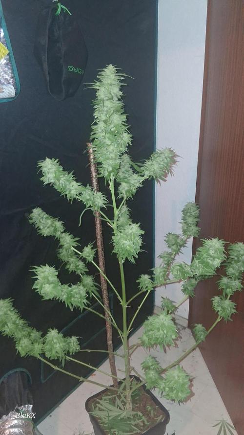 BlaKX Plan B kommt langsam in fahrt Growmies;) Leider ist sie mir etwas als ich 3 tage weg war etwas ausgetrocknet so das ich zur Sicherheit den topf getaucht und es hat anscheinend kein Dünger aus dem Substrat gewaschen. Habe unten 2 Seitentriebe entfernt und paar Blätter. Man merkt aber am Durst das sie voll in der Blüte ist sie säuft ohne Probleme den Topf in 1,5-2 Tagen leer und Gieße nur Wasser.