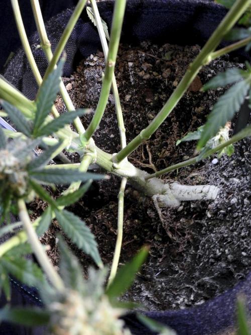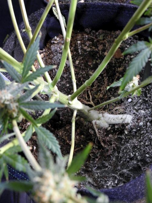 The girls are absolutely towering now, monster plants with stacked colas and pistils shooting out everywhere. Their root systems are so strong that some roots at the soil surface are even thicker than the stalks themselves.