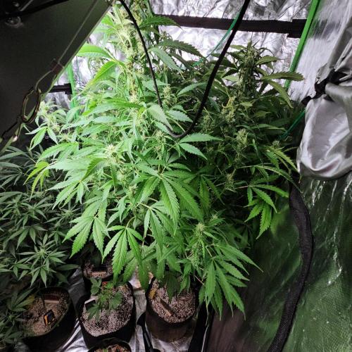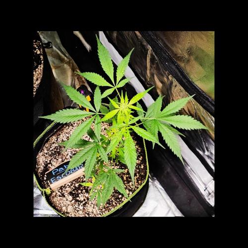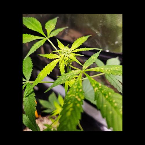 Kirsten This week, Pablo Escobar is definitely going into flowering. She is only about just over a foot tall, and some of the leaves on the top of the plant have spots on them.