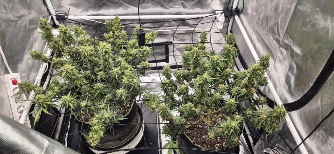 mihixd 2 plants have finished stretching while the 2 small ones are still in veg? vegging plants are ~40cm, biggest plant 75cm😄 D29 2L bottomwatering, last time i defoliate the plants for at least one week. D32 mix or top and bottomwatering 5L per plant. 2 blooming plants got calmag+bloom, vegging plants got calmag+grow+pr I definitely overwatered today a bit, but the plants handled it fine. D34 Placed a new light above them. 600W from