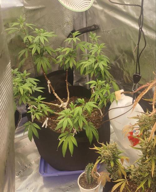 ThomFoolery 7/21 My humidity reading on the controller is all over the place. I guess I need to call ac infinity because it is constantly wandering off point. I'm not even sure what is right anymore. And don't get me started on the laser temp gun.. jeez. It's all just a shot I the dark. I have tried purchasing a decent hygrometer but the one I got isn't as sensitive and it never seems to be right either. So the main one I'm going by is the one on the hon&Guan fan I have. It seems to be right on temp and humidity. The temp is right on all devices it's just the humidity I can't trust. If I'm going by the H&G, then the pro 69 humidity is right +3 or as much as -6 and this can be off any time of the day. This shit is crazy. I don't want to have to go through the hassle of having to go through support, send back the controller, etc, etc .. hell it's almost easier just to spend the 139 and buy a new one... The one with 8 ports instead of 4. Anyway..... Since it seems like im fucking guessing what the humidity is she still seems to be doing well. I have been picking at her for a few days so she's not doing much. I have Introduced a CO2bag, but I'm not optimistic. I totally got rid of the active intake. It was just not working. The passive intake works like a charm. I mean it cools down really quickly. Hell, it makes it difficult to get the temp to go over 80. Ill have to set the AC thermostat to 75 to get 81.... Any warmer and I'll be sweating in here!! The exhaust fan is so effective and efficient I have it on 1 and it seems to be about where I need it. (No carbon scrubber as of yet. There is no smell. No sense cashing out the charcoal before she starts to flower) One fan below the light , one above. All on low and the system is just purring. The only thing I don't like is how the humidifier really, really cools down the tent. I really need to have it warmer and humid to try and get this co2 bag to work, not humid and cooler. My main concern is that she just doesn't drink hardly any water.. so that means the transpiration is off.. I keep the vpd in range... But is it? I mean if the humidity is never right how do I know? I could be right on target, or I could be as much as 10% off... Fucking hell.. For the next 3 days, I'm laying off this little girl. I'm going to try and figure out this humidity reading issue but I don't need to do anything for the plant. She needs be left alone so she can recover and start growing again. I know all my interference has slowed her down, but she should have been growing faster anyway. Something isn't quite right. 7/22 A bit of light stress. Yeh, I wasn't sure at first, but yeh. The newest growth closest to the lights is looking bleached. Moved the light up 3". Since I took out the active intake... man! Smooth sailing. I was even able to adjust the ambient temps to 79-80 for day time and 74- 76 for night... I'm hoping that the CO2 bag will do its thing. Yeaaaah, I'm not real optimistic here, again. But it's usually my experience when I think one thing, the other is almost always what I get. So hell, do your best! So now I guess I need a light meter? My God y'all... I have never owned so many fucking gadgets to grow weed. But, I feel compelled to buy it all. Then I want to incessantly watch the metrics and try to keep it somewhat copacetic... Not trying to hit a finite target, but camp out in a range of values the cannabis gods (or those whove come up with the acceptable ranges) have deemed suitable. But like I said way back on the first days. This grow is to dial it all in . Feel it out and get used to growing in a tent. So... We still going and the only real issues I've seen so far were of my own, and what I've done to that poor girl. But she will spread out. Letting her recover. Humidity sensor issues are at bay. No water needed. Moved light up 3" Environment is on low and readings are pretty stable. For the first time in my eco, a spray of mist will last 10, 15, even 20 seconds. Sometimes more. Purring ... 7/23 All is well. I'm on the 3rd day since I hung the cO2 bag. I really don't want to buy a cO2 meter man.... Lol I should have known, as soon as I purchased something to alter a part of the environment I would need a way to monitor said changes... Probably once, twice, and I'll never use it again. Unless I see a difference. I'm just going to give her another week on that. They aren't exactly cheap. * That night * I implemented some creative LST with hemp twine and some strategically placed drill holes. I literally had nothing else on hand and I've spent enough.. roughing it. Afterwards to dull the pain: Watered her 4.5 cups ph balanced declorinated tap water with a dose of Superthrive. She is already responding in the images. 7/24 Looking really good. Two more days and I'll do the final topping to double what I have now then two more weeks in veg, and finally 12/12, hopefully. 7/25 She is doing better than I expected. I almost hate to slow it down by topping her again. But... More to come.