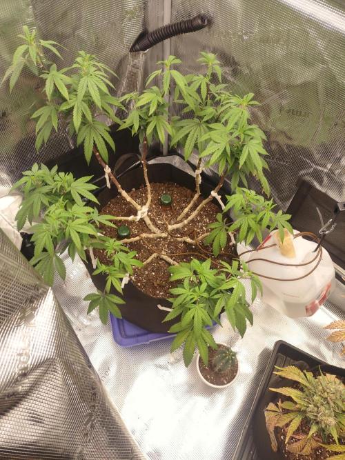 ThomFoolery 10/6 She's made a complete turnaround and these 2 pics are the last two before I severlty cut her back. I left only 2 or 3 spots of growth on each branch. It was a drastic decision but I don't want to play to be a 4 foot bush. I'm still endeavoring to keep her small and defined. I gave her a half dose (30mg/gal = 0.7EC) of big bloom because she needs P and K and in my recipe I used bone meal. It usually takes a few months for it to be readily available so the big bloom is just a bridge to get her there.. I wish I'd not cut her undergrowth back so much the last time. And I could have kept her smaller but this entire fiasco of a grow has been by the seat of my pants and I'd really just like to harvest her at some point . I got some really nice cuttings and I am going to attempt Io root them in the hopes that I can flower then right beside her. (If not I've plenty more seeds) Put her in the middle with 2 or 3 clones on each side. They will probably be difficult to root because they are so mature and the actual tips and not side shoots. I'm tempted to make an aeroponoc cloner so I dont have to worry about the success rate. Or buy one. I don't think it's much cheaper either way. 10/9 It's like starting all over. She still has at least 3 weeks to fill back out and then it's flower time for this aging beauty. I didn't get any new pics this morning but I've really cut her back. I'll post some in a day or two but I only left 2 or 3 shoots per limb. She should do well smack in the middle of the tent...