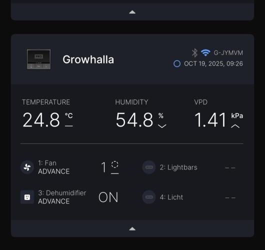 🔸The SANlight remains at 90% and ~30 cm distance (approx. 900 PPFD at the canopy). The leaves appear relaxed, without claws or lightening – so no indication of light stress. I keep the climate rather moderate, with good air circulation through the foliage so that the fresh resin heads remain dry. It's a bit cold at the moment, so I can't quite reach the VPD, but I'm not going to put a heater in, hehe.