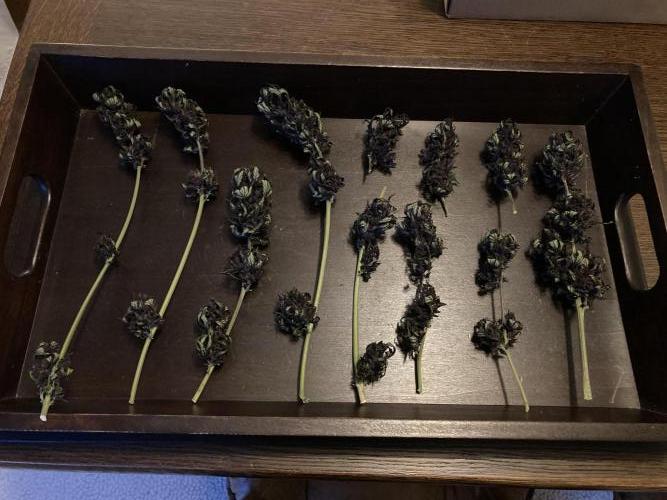 I harvested my Purplematic CBD and washed the buds with a mixture of baking soda and lemon juice. Some caterpillars 🐛 came out of the buds 😱!! I hung the branches up to dry in a spare dark room with a ventilator. After 10 days of drying the branches still wouldn’t snip. I think the room was too cold and too humid. Next time I’m using a dehumidifier.