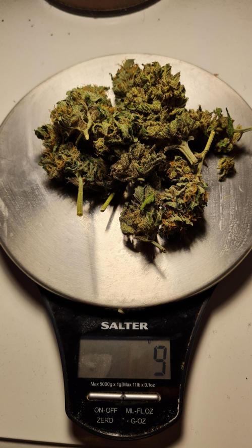 A day after my last update i found a bit of mould in the side of her top bud, i wanted her to run about another week bit i chopped straight away before any spreading. Shes dry and have got 9grams which as she was only in a small pot isnt bad ๐