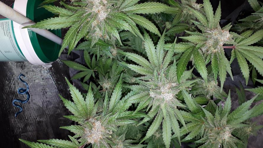 DID A MAJOR DEFOLIATION TO HELP CONTROL THE HUMIDITY AND MORE LIGHT PENETRATION. WHEN YOU REMOVE AS MUCH LEAF AS I DO, YOU GET WAYYY MORE BUDS BUT THEY ARE SMALLER BUT IT HELPS LOWER THE HUMIDITY VERY WELL