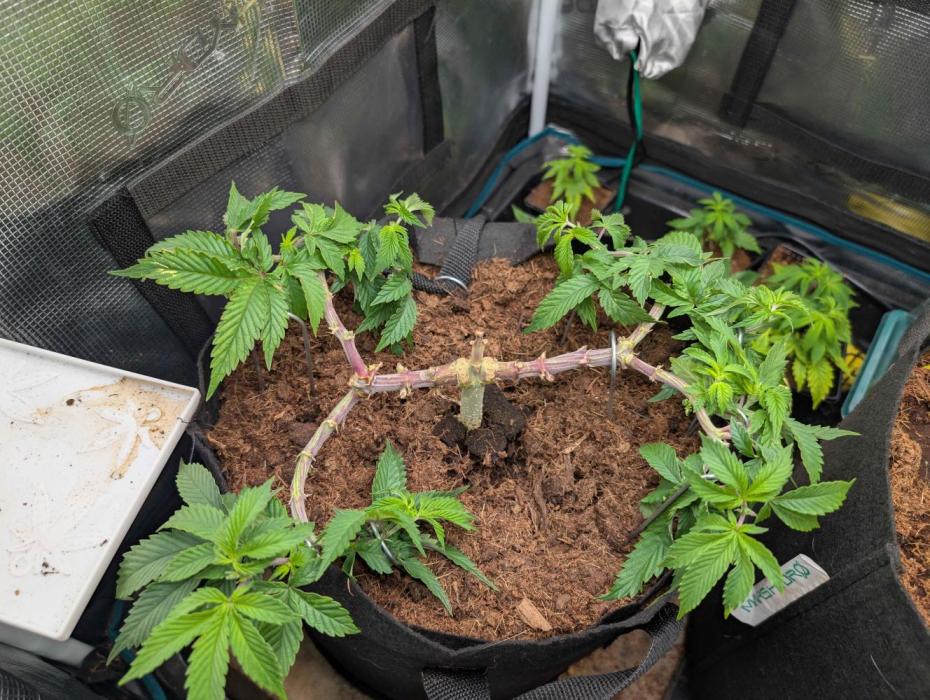 Topped, Defoliated and main-lined. Trying to save some cuts.