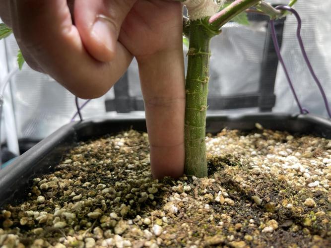 The substrate is coco with a bit of clay pebbles and some perlite. I plan to increase the perlite ratio when transplanting into the 15‑liter pot later.