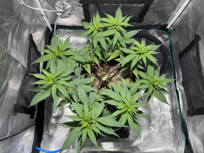 SamDo Week 10 Update This week overall looks solid. The plant is in good health and has responded really well to the topping I did last week. The canopy has filled back out, it’s denser, and the structure is becoming more balanced. During this session I went in with a major defoliation, another topping, and some LST to shape the plant. Unfortunately, while doing the training, one of the junctions between a branch and the main stem cracked slightly. To support the recovery, I applied a small piece of tape as a bandage to help the plant heal and close the wound. Structurally, we now have four main branches, each with two fresh tops — which means eight apexes in total. The plan now is to let her recover gently and monitor how she develops over the next days. Environmental conditions are stable. Temperatures have cooled a bit, averaging around 22–23°C, with relative humidity hovering close to 70%. This range feels comfortable for the plant. Regarding pH, I no longer check the runoff in the saucers because it doesn’t make sense. Fresh nutrient solution leaving the reservoir at 5.9–6.0 will measure fine at first, but three days later the leftover solution in the saucer gives a completely different number. It’s not representative, so I just focus on locking the reservoir pH between 5.9 and 6.0. The plant seems to handle this approach very well. Nutrients remain unchanged for now. I may have added a touch of Rhino Skin, which I didn’t mention earlier in the diary, but it’s there to start strengthening the plant tissues in preparation for heavier branches later. So far, everything is steady. We’ll let her settle, recover, and keep following the evolution week by week.