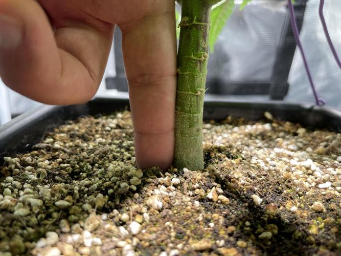 SamDo Hi, and welcome to my new grow journal! After two failed grows, I’m really hoping this one turns out better. I made some changes to my setup—most importantly, I moved my grow tent to a new location. I think the old spot wasn’t ideal, and I’m confident this adjustment will help me get stronger results this time. This round, I’m running a Pineapple Upside Down Cake from Humboldt Seed Company. The seed popped after just 48 hours directly in coco coir—super encouraging for what’s ahead. For the start, I’m using a 1‑liter AirPot adapted to work with an AutoPot system. I’ll see how it performs before moving the plant to its final 15‑liter AutoPot setup. For nutrients, I started simple: 2 ml/L of Voodoo Juice and brought the EC up to 0.4 using FormuleX, all in 0 EC reverse osmosis water. pH is dialed in at 5.8. Hopefully, this isn’t too much for such a young plant—we’ll find out soon enough. The seedling is in a 70x70x160 cm Mars Hydro grow tent under an OpticLED GMax 300, currently set to blue spectrum only. I’m also keeping a humidity dome over the sprout to maintain high moisture levels around it. The substrate is coco with a bit of clay pebbles and some perlite. I plan to increase the perlite ratio when transplanting into the 15‑liter pot later. That’s it for now—we’ll call germination complete. I’ll post an update in a week once she’s been out of the coco for seven days.