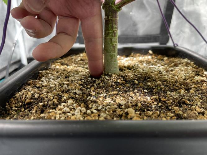 The substrate is coco with a bit of clay pebbles and some perlite. I plan to increase the perlite ratio when transplanting into the 15‑liter pot later.