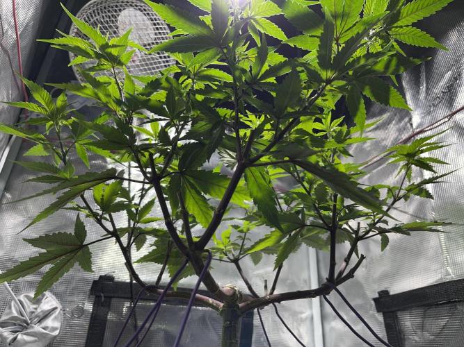 During this session I went in with a major defoliation, another topping, and some LST to shape the plant. Unfortunately, while doing the training, one of the junctions between a branch and the main stem cracked slightly. To support the recovery, I applied a small piece of tape as a bandage to help the plant heal and close the wound.