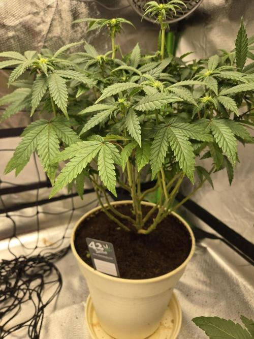 MrGrowDiarie Day 42 – Vegetation This plant is looking well-trained and spreading out beautifully! The main stem has been opened up with some strong LST, allowing light to hit every single top. New growth is healthy and vibrant green, with multiple bud sites forming along the branches. The structure is flat and even, creating an ideal base for a wide, productive canopy. No signs of stress from the training – she handled it like a champ. Over the next few days, she’ll keep focusing on filling in those gaps and building strength before the flip to flower in 6