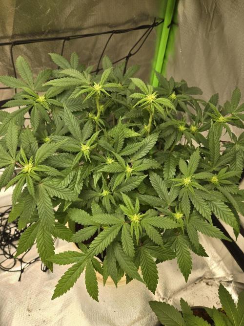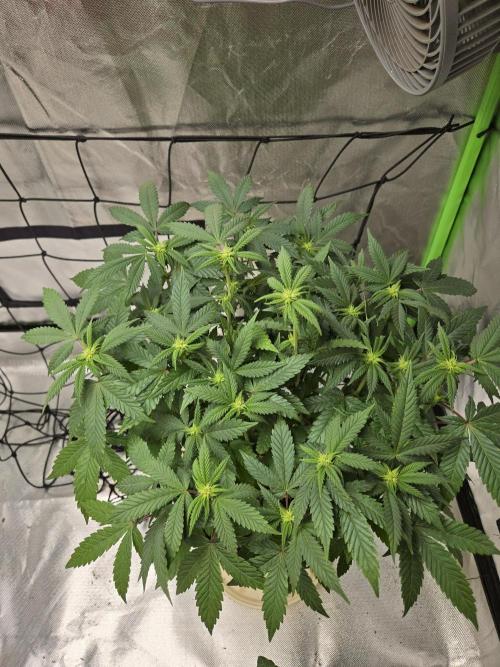 MrGrowDiarie Day 70 – Flower Week 1 (Flip on Day 67) The plant has transitioned into flowering smoothly. The wide, low structure from the veg phase is still obvious—a dense, even canopy stretched neatly across the scrog net. Multiple tops are sitting at a uniform height, and the first small pistils are starting to show. Foliage remains mostly healthy: a rich mid-green with a slight sheen. A few of the older fan leaves down low are beginning to yellow lightly, which is normal at this stage as long as it doesn’t accelerate. New growth at the top looks vigorous, a sign that the root zone is active and stable. The post-flip stretch has started but remains moderate, which suits the flattened training style well. Light penetration across the canopy is excellent, giving every bud site an even start.