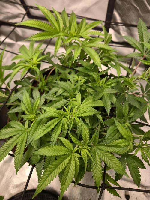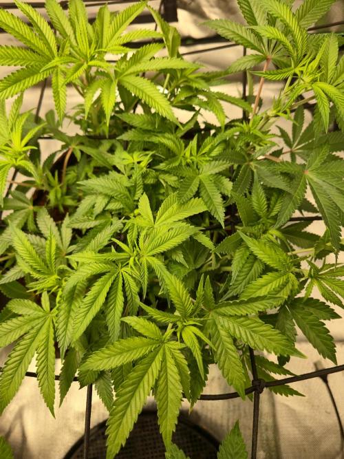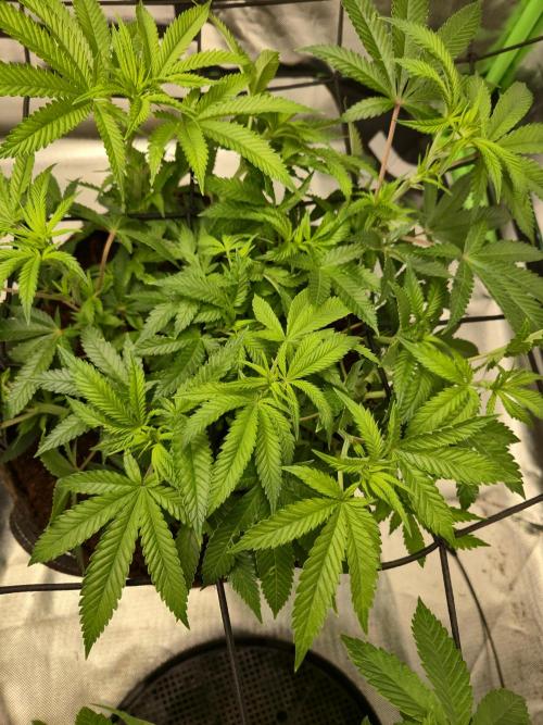 There are no clear signs of stress or deficiency — leaves are healthy, edges are smooth, and the color is consistent. The canopy is lower and denser than the bigger plants, but that’s expected after topping. With some time, the side branches will continue to catch up, forming a nice even top layer.