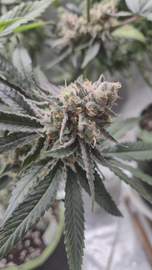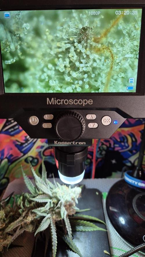 Nach genauerer Betrachtung unter dem Mikroskop scheint die Pflanze schon nahezu fertig zu sein, haben uns daher wieder zu einer Teilernte entschieden die Headbuds können schonmal ab. Der Rest darf noch etwas nachreifen. Was uns schon etwas wundert, ist die Tatsache das die Blume mit 56 - 63 Tagen angegeben ist aber schon jetzt fast vollständig ausgereift zu sein scheint!?