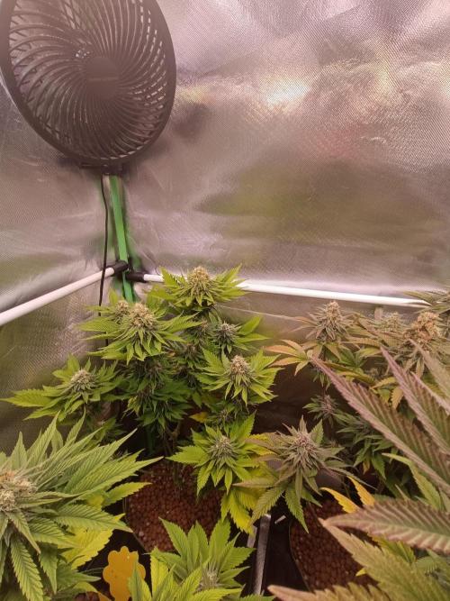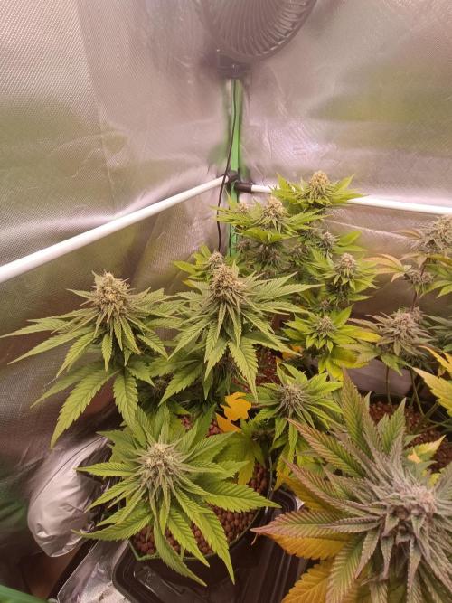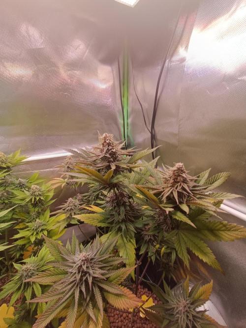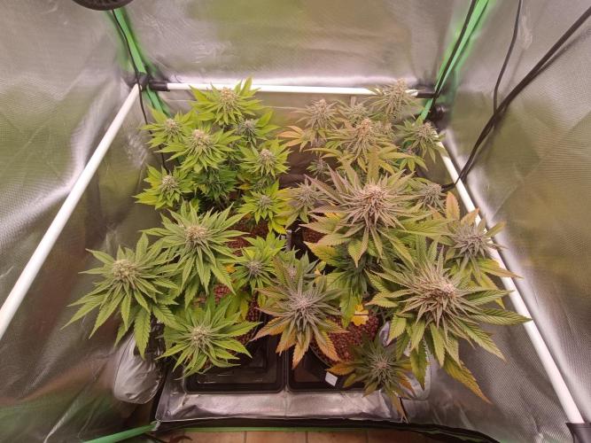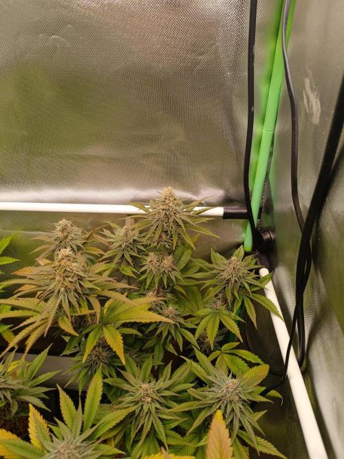 Rhah420 Erste Woche der Blüte ist um, der Stretch beginnt so langsam. Ich habe noch einmal mit Nematoden gegossen. Das Gießwasser Stelle ich nun eher auf pH 6.5 ein. Sonst hat sich nichts verändert, ich gehe davon aus das der Stretch in den nächsten 2 Wochen seinen höhepunkt erreichen wird, ggf. Muss ich die Damen etwas biegen.