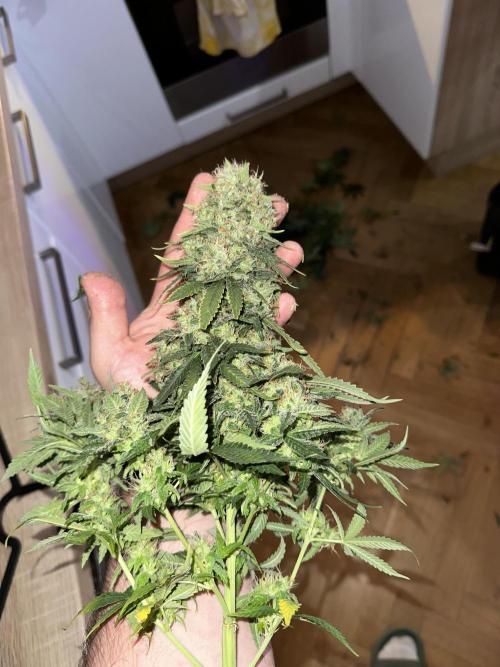 I_roll_my_own_420 After 10 days of flushing, time to harvest. End of week 8 of flower. Smells amazing. Im drying in tent, cant get the temp under 23 celsius. Thats why Im drying plants without a lot of trim. Buds are full of trichomes, 30h of darkness before harvest. Almost all buds are pretty big, so far sooo good 😅.