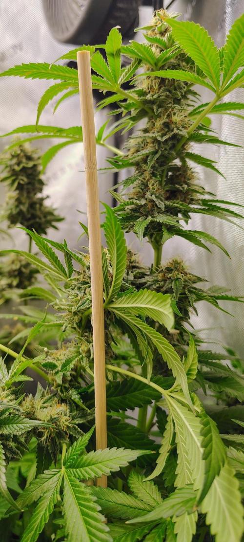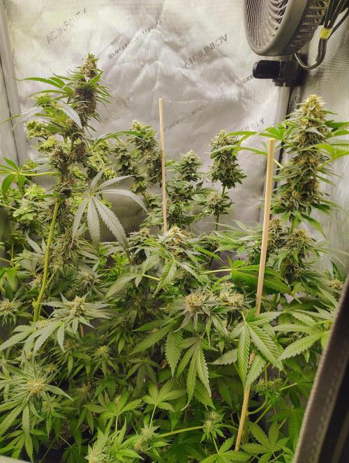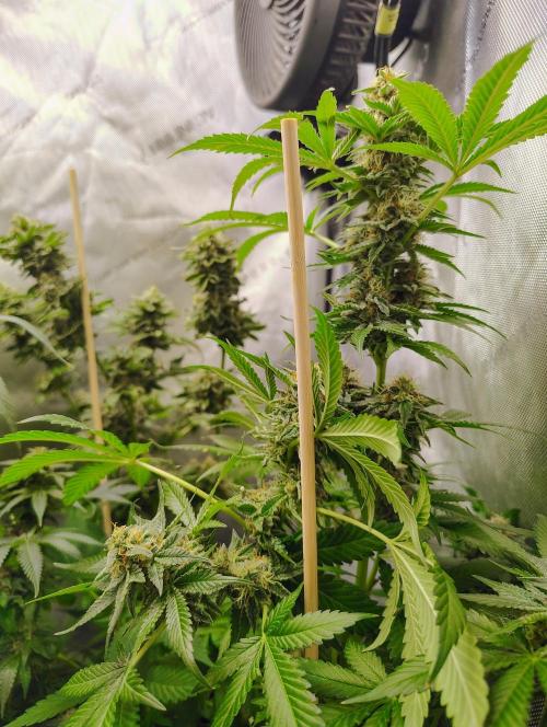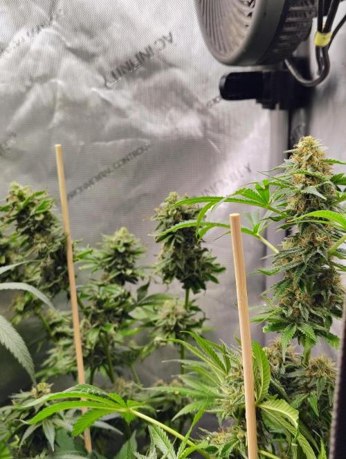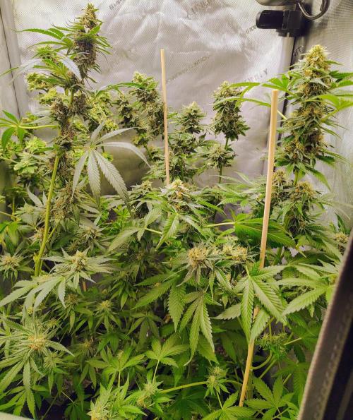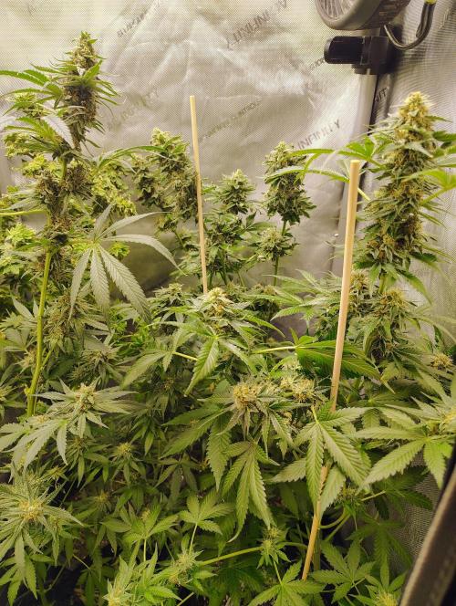 JolliGrowz27 I defoliated and lolli popped the 3 plants in the tent. I also used the bottoms to try monster cropping clones. I've never done this before. I wanted to try it to see how strange they will become. I also fed them yesterday morning 9/27/25 with Age Old Organics Bloom 5-10-5 at 2 tbsp per gallon, Age Old Organics Fish+Seaweed 3-3-2 1.5 tbsp per gallon, and a double dose of Real Growers Recharge. The plants have slowed down on stretching and are putting on weight. I had to tie one of the bottoms up for support. I used garden wire. So they're fattening up and frosting up now.