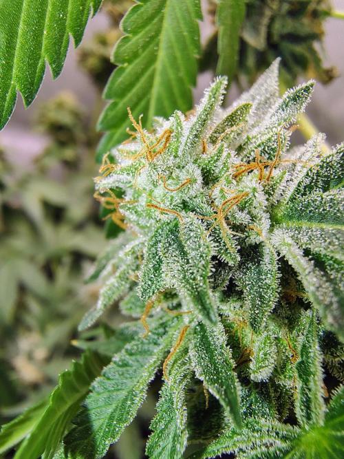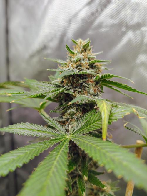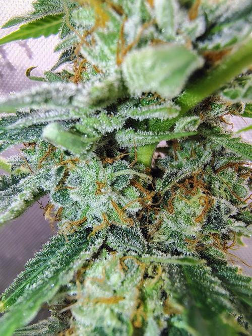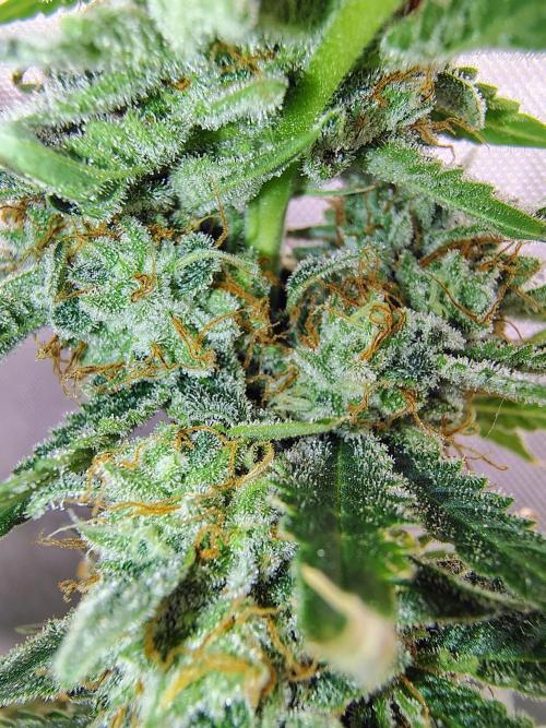 I had to remove a few dead leaves but other than that, there was nothing going on. I just watered yesterday morning fed the clones some Gaia Green. I have harvested a couple branches from both plants. I have the remaining Pheno left for flower, Gorilla Gas F1 Fast Pheno 2. Pheno 1 got locked out so I harvest it for bubble hash. Pheno 3 which was the frostiest and fastest to flower, I also used for the bubble hash collection in the freezer. I have the clones of all 3 plants growing and flowering already. I have a small veg tent now to keep a perpetual harvest going. I also started some Applenaut from Multiverse Genetics. Applenaut is a S1 hybrid cross of Dirty Sanchez X Wedding Cake. Applenaut is described as having a tangy green apple aroma and is uplifting yet relaxing. I have one of my crosses growing as well. They're both ready to harvest now, but I like to give em 1 more week when I think they're done just to reassure myself that I waited long enough.