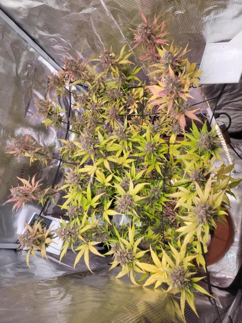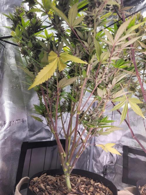 This is the beginning of the end! Everything seems to be going well. I've spaced out my waterings even further and started flushing. The senescence seems more normal and reasonable now! I plan to give it one last water tomorrow and then wait until it's completely dry before cutting.