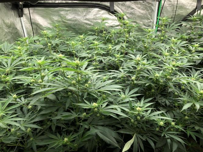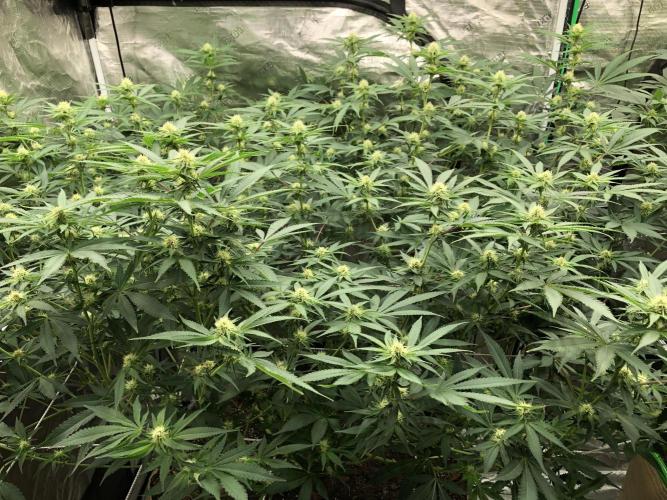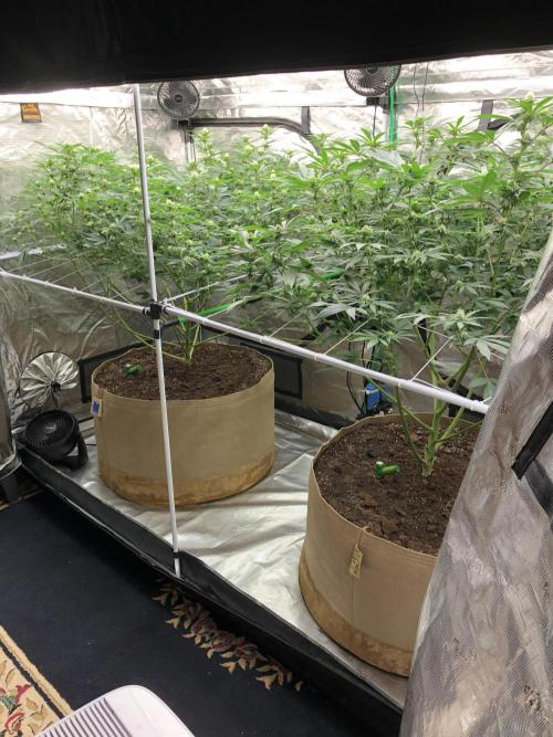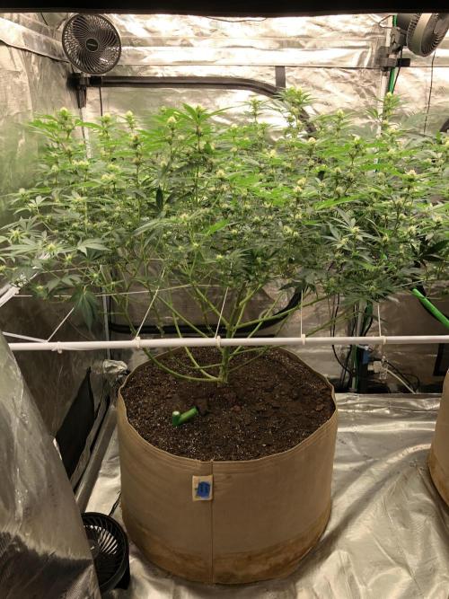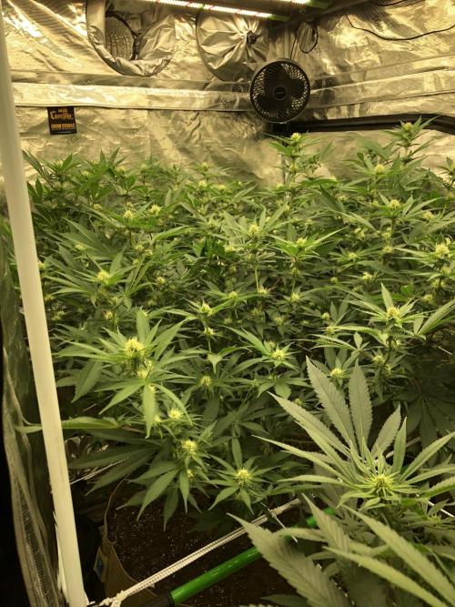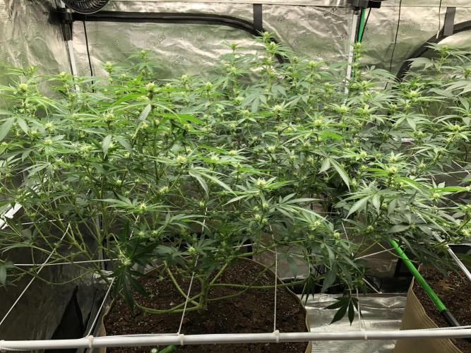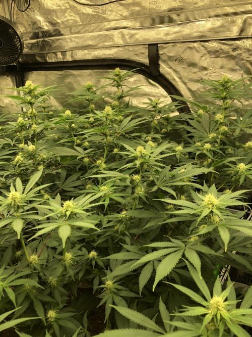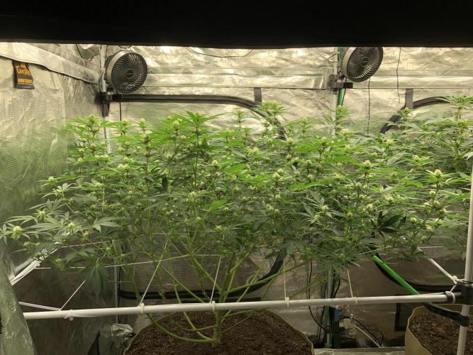 MindFlowers68 Kind of rough few weeks so going to do a combined weekly comment for my 4 diary's this week. Had app for my wisdom teeth being pulled last Thursday at local dental school but they only took two out last week and they pulled last two yesterday. Monday last week I peeked into my tent and had a Joe Pesci moment when I looked into the window and found a few spots of fucking powder mildew starting. Couldn't have been worse timing with having to recover but I had no choice but to get my ass in the tents and defoliate. I found maybe 4 leaves per plant with a few specs of it. I took out quit a bit out, but the plants still had plenty of younger healthy leaves to make energy. I really don't know how it started. I've been running the dehumidifier more than normal because I tend to run a high humidity because its so hard to control in my area so i started running it day and night in my lung room. My tents humidity never got above 55 percent and the plants have been thriving. I was completely shocked having never had it inside to get it. I think because my tents conditions were so optimal my ac infinity controllers telling my exhaust fan to run on lowest setting at night. I noticed i started getting Pm on my outside plants when it was super dry too, I don't understand I thought mold likes moisture. That along with my last top dress could have been worked into the soil better and it started to rot a little on top so maybe that's where the spores came from. Now that I'm done with top dressing, I'm going to cover the soil with pine or cedar chips to help keep them clean and happy. I set the minimum exhaust fan speed high so It will keep more air flowing and i moved one of the Honeywell fans on the floor from the back left corner to the front left corner to get more circulation going. To kill the Powder mildew I turned the lights full blast and got both tents to 105 degrees F for a few hours, then ran an ozone UV-C light right after lights turned off for about 5 minutes in each tent. I then made up my last batch of boogie brew for the season and fed them to the plants a few days after to help repopulate any microbes I killed and to help them recover. I think I did just enough to kill the PM without harming the plants/root zone much at all. A few hairs turned color but no leaf discoloration or tip burn from he heat. The plants are looking a little nitrogen rich at the moment but I I've been letting the pots dry out to control humidity so the TDS of nutrients are a little elevated.