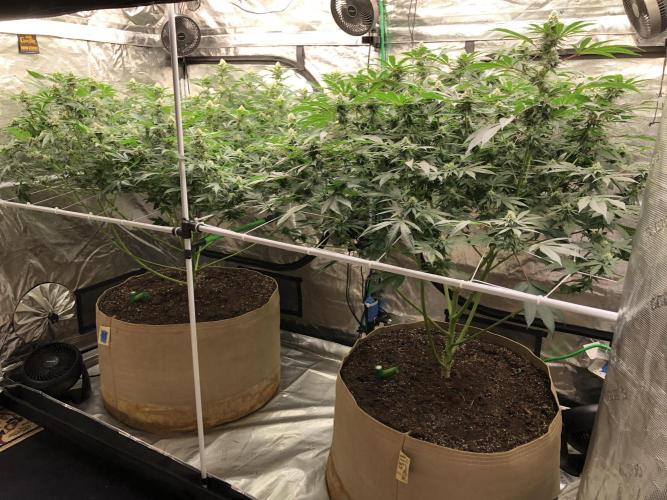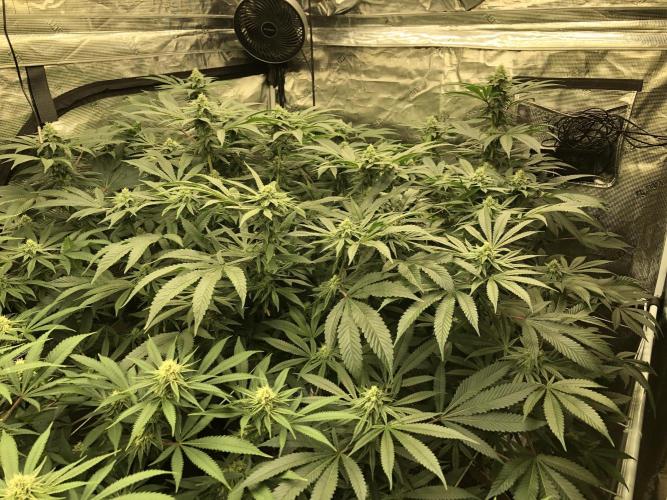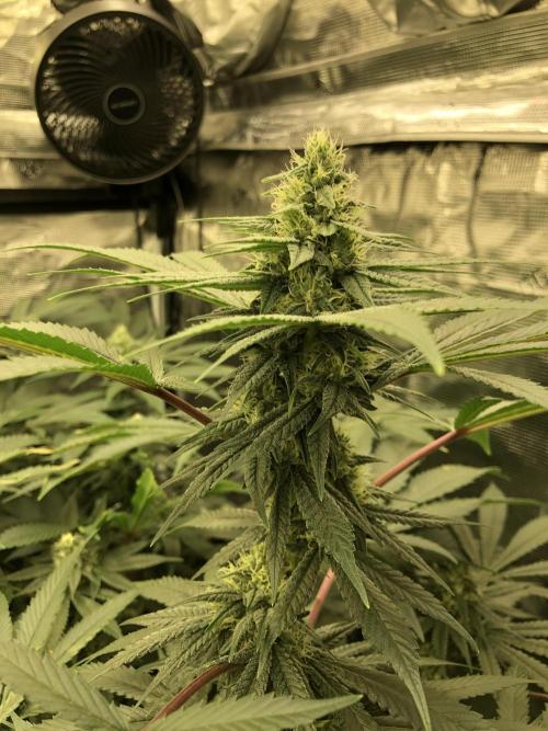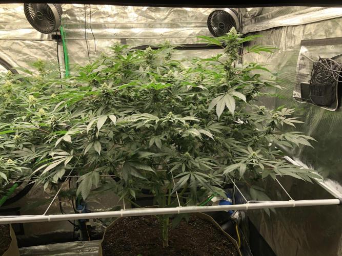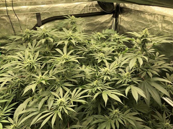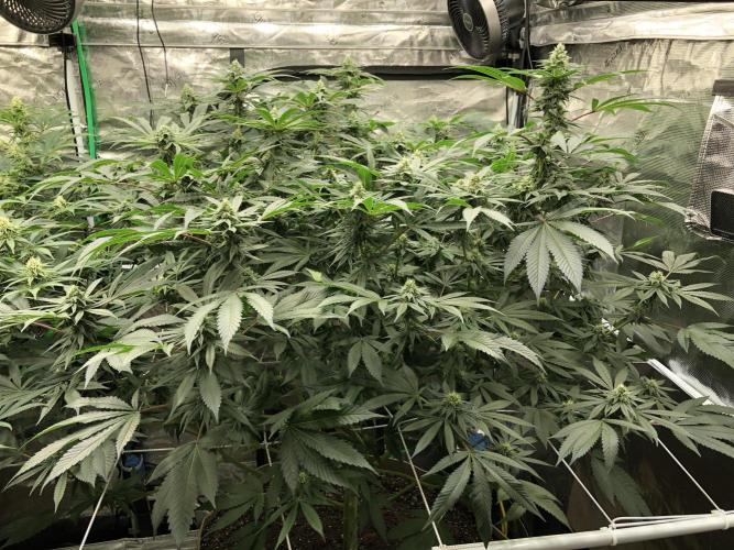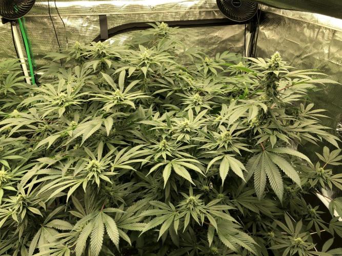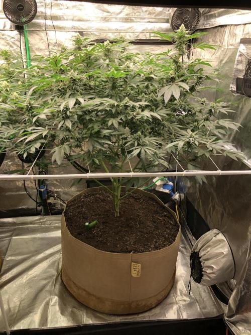 MindFlowers68 Kind of rough few weeks so going to do a combined weekly comment for my 4 diary's this week. Had app for my wisdom teeth being pulled last Thursday at local dental school but they only took two out last week and they pulled last two yesterday. Monday last week I peeked into my tent and had a Joe Pesci moment when I looked into the window and found a few spots of fucking powder mildew starting. Couldn't have been worse timing with having to recover but I had no choice but to get my ass in the tents and defoliate. I found maybe 4 leaves per plant with a few specs of it. I took out quit a bit out, but the plants still had plenty of younger healthy leaves to make energy. I really don't know how it started. I've been running the dehumidifier more than normal because I tend to run a high humidity because its so hard to control in my area so i started running it day and night in my lung room. My tents humidity never got above 55 percent and the plants have been thriving. I was completely shocked having never had it inside to get it. I think because my tents conditions were so optimal my ac infinity controllers telling my exhaust fan to run on lowest setting at night. I noticed i started getting Pm on my outside plants when it was super dry too, I don't understand I thought mold likes moisture. That along with my last top dress could have been worked into the soil better and it started to rot a little on top so maybe that's where the spores came from. Now that I'm done with top dressing, I'm going to cover the soil with pine or cedar chips to help keep them clean and happy. I set the minimum exhaust fan speed high so It will keep more air flowing and i moved one of the Honeywell fans on the floor from the back left corner to the front left corner to get more circulation going. To kill the Powder mildew I turned the lights full blast and got both tents to 105 degrees F for a few hours, then ran an ozone UV-C light right after lights turned off for about 5 minutes in each tent. I then made up my last batch of boogie brew for the season and fed them to the plants a few days after to help repopulate any microbes I killed and to help them recover. I think I did just enough to kill the PM without harming the plants/root zone much at all. A few hairs turned color but no leaf discoloration or tip burn from he heat. The plants are looking a little nitrogen rich at the moment but I I've been letting the pots dry out to control humidity so the TDS of nutrients are a little elevated.