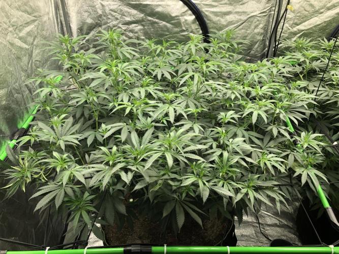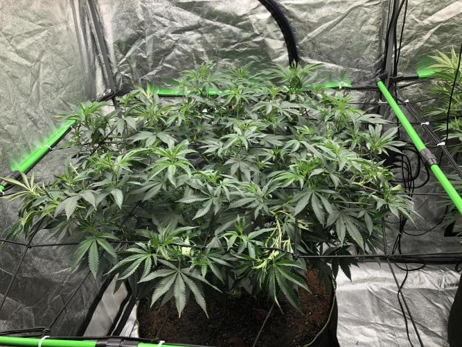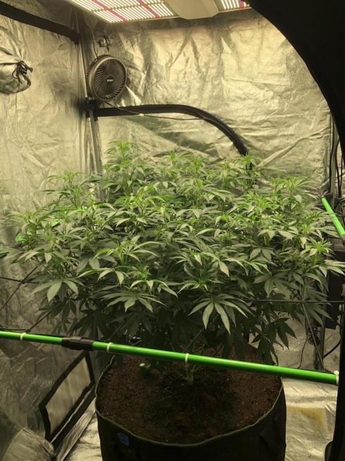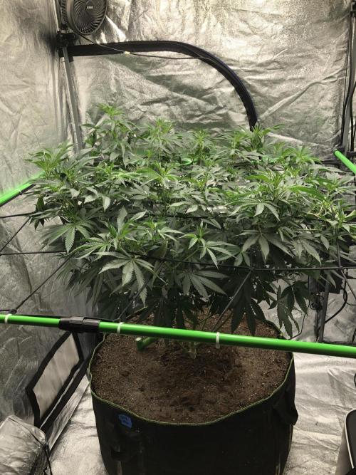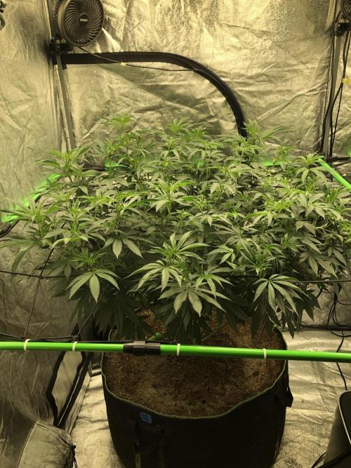 MindFlowers68 There is not much to report this week as thing are on autopilot and going smoothly. The foliage shows the plant is thriving, and little to to no signs of stress. I only had to water once this week. The only other thing that was need was training some of the branches down and to the edges of the tent. She's pretty much got a perfect canopy going, and was able to control some of the stretch by scroging. After training I think i may have nearly doubled the amount of tops on the plant from the new nodes growing in strong and starting to stretch. I dialed back the humididty down to 58 percent and going to try and lower it gradually to 45 by harvest time.