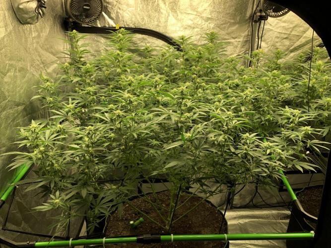 MindFlowers68 Kind of rough few weeks so going to do a combined weekly comment for my 4 diary's this week. Had app for my wisdom teeth being pulled last Thursday at local dental school but they only took two out last week and they pulled last two yesterday. Monday last week I peeked into my tent and had a Joe Pesci moment when I looked into the window and found a few spots of fucking powder mildew starting. Couldn't have been worse timing with having to recover but I had no choice but to get my ass in the tents and defoliate. I found maybe 4 leaves per plant with a few specs of it. I took out quit a bit out, but the plants still had plenty of younger healthy leaves to make energy. I really don't know how it started. I've been running the dehumidifier more than normal because I tend to run a high humidity because its so hard to control in my area so i started running it day and night in my lung room. My tents humidity never got above 55 percent and the plants have been thriving. I was completely shocked having never had it inside to get it. I think because my tents conditions were so optimal my ac infinity controllers telling my exhaust fan to run on lowest setting at night. I noticed i started getting Pm on my outside plants when it was super dry too, I don't understand I thought mold likes moisture. That along with my last top dress could have been worked into the soil better and it started to rot a little on top so maybe that's where the spores came from. Now that im done wih top dressing, I'm going to cover the soil with pine or cedar chips to help keep them clean and happy. I set the minimum exhaust fan speed high so It will keep more air flowing and i moved one of the Honeywell fans on the floor from the back left corner to the front left corner to get more circulation going. To kill the Powder mildew I turned the lights full blast and got both tents to 105 degrees F for a few hours, then ran an ozone UV-C light right after lights turned off for about 5 minutes in each tent. I then made up my last batch of boogie brew for the season and fed them to the plants a few days after to help repopulate any microbes I killed and to help them recover. I think I did just enough to kill the PM without harming the plants/root zone much at all. A few hairs turned color but no leaf discoloration or tip burn from he heat. The plants are looking a little nitrogen rich at the moment but I I've been letting the pots dry out to control humidity so the TDS of nutrients are a little elevated.