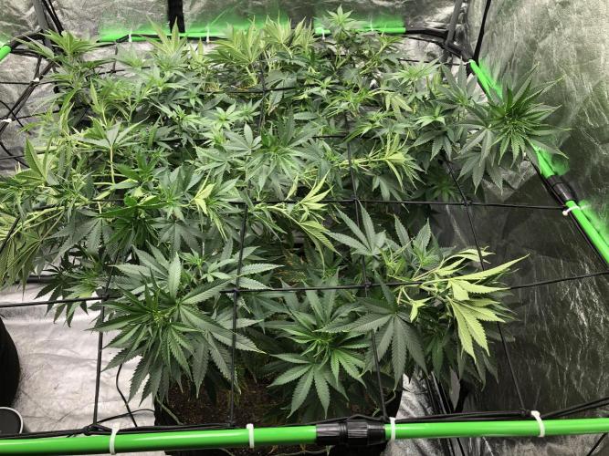 MindFlowers68 The day after transplant she was looking really good, but as the week went on, you could tell she was a little unhappy from the soil and mixed up. It just got a little too wet when I had it sitting and I didn't realize it didn't get bad smell in but it was just a little rich. Honestly thought she was going to handle it better than all the other plants but she got a little burnt on the Tips I didn't wanna do it too soon but I got her watered again to settle it in and try to get some more oxygen and lower the ppm's a little bit. I can only veg for another week due to time constraints, but I think she'll bounce back OK. I normally try to get the net completely filled but we'll see how she does stretching in. Maybe it eill reduce the amount of lart a little bit.