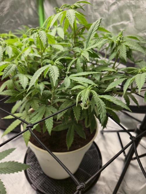 This little one is struggling a bit after being overwatered. The leaves are drooping heavily, and some lower fan leaves are starting to yellow and fade, clear signs of too much moisture in the root zone. The canopy is still intact, and new growth looks like it will bounce back once the soil dries out.