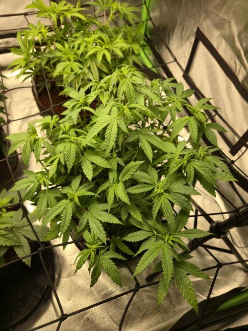 This plant looks fairly healthy overall, with a dense and compact structure. The canopy has filled out well, showing tight node spacing and several potential tops developing. Leaves are mostly a solid green, though some lower foliage is beginning to fade and yellow slightly, which may point to early nutrient demand or reduced light penetration.