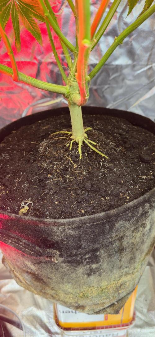 Das hier ist echt ein Biest! 🚀 Die Wurzeln sind von allen Pflanzen am krassesten gewachsen – richtig verrücktes Wachstum unter der Erde 🌱. Oben ist sie dagegen sehr stämmig und kompakt, was stark nach einem hohen Indica-Anteil aussieht 🍃💪.