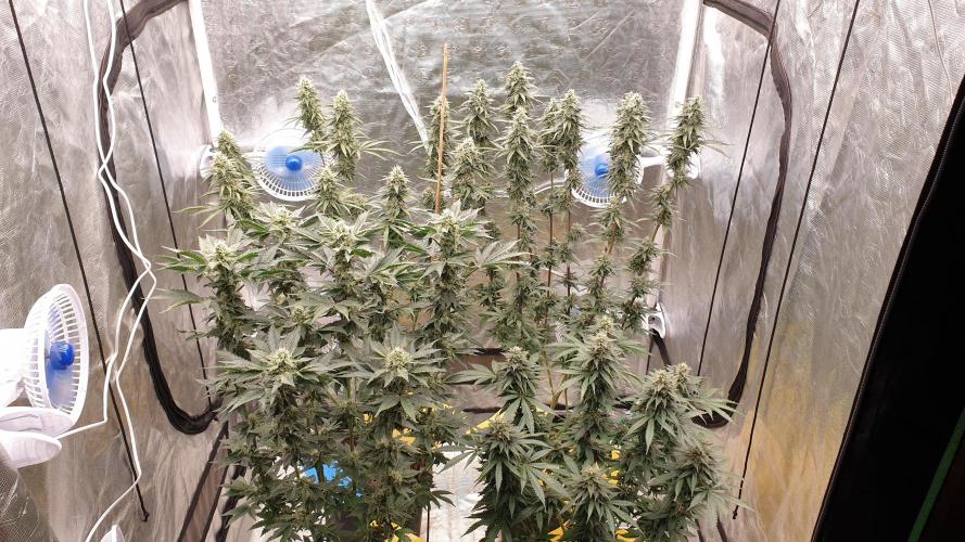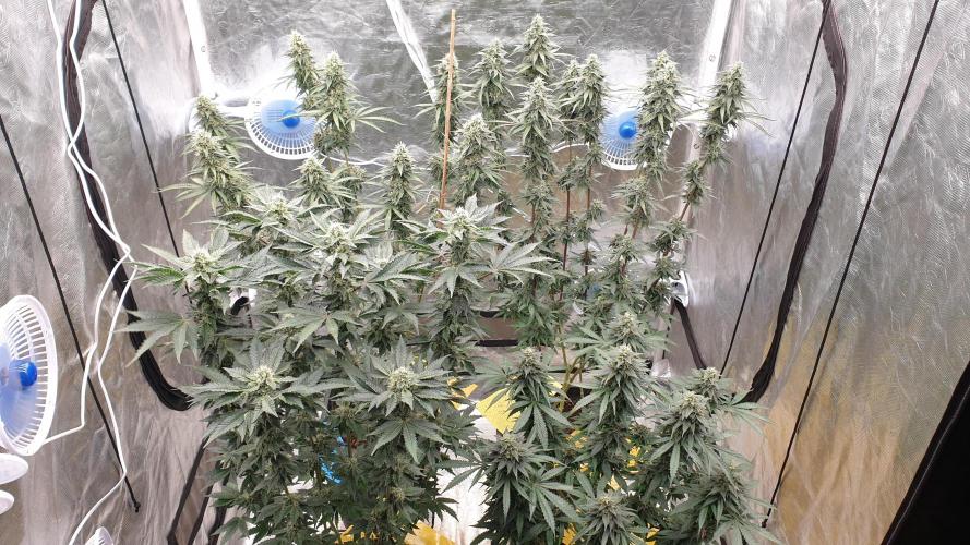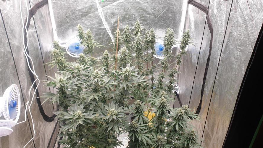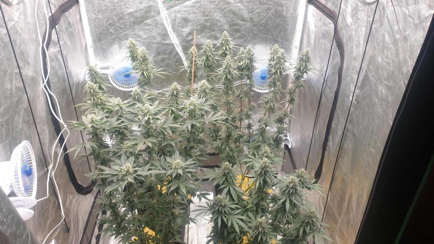 RomeoAlphaWhiskey day57:watered and fed 2.6ec 6.0ph day58: some plants are hermaphrodite , i remove most of sacks, watered 6.0ph day59: watered 6.0ph day60:watered 6.0ph day61:watered 6.0ph removed most leaves for mites control day62:watered 6.0ph added traps day63:watered 6.0ph and fed 2.4 ec