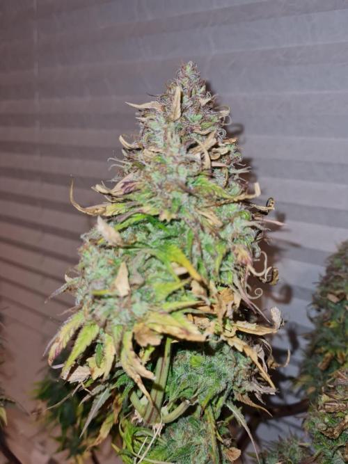 CeeJayy420 It is hypothesized that the initial leaf clawing was a response to nutrient imbalance or light stress. Following environmental adjustments, the plant is now exhibiting vigorous growth with minimal remaining signs of clawing. The foliage remains unusually dark green, which may indicate elevated nitrogen levels or high chlorophyll density. Surprisingly, a distinct aroma is already present, suggesting early terpene synthesis potentially triggered by stable LED spectrum and optimized growing conditions.