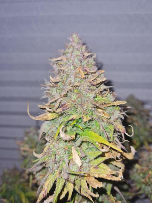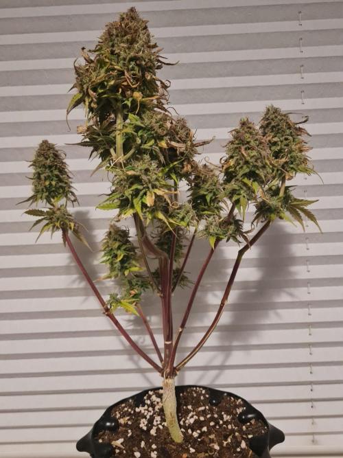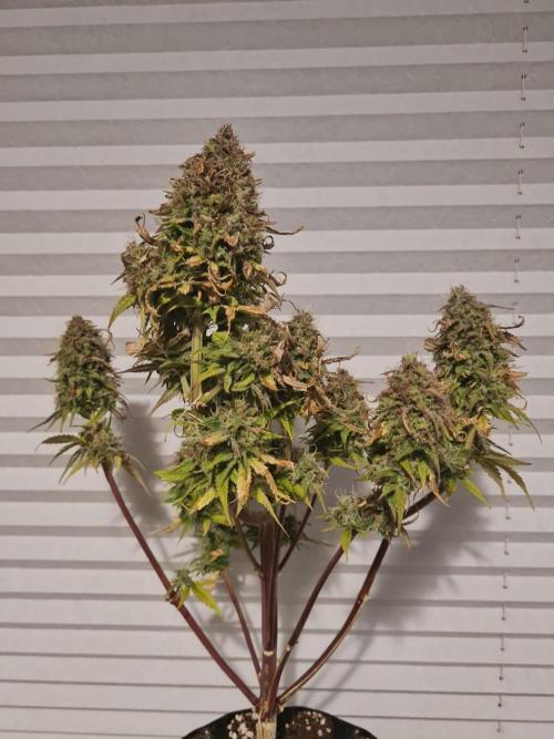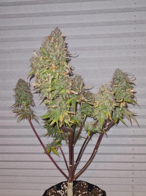 CeeJayy420 The plant has fully entered its autumn phase, with vibrant seasonal coloration and numerous wilted, nutrient-burned leaves, which have been removed to reduce stress. This suggests that earlier overfeeding may still be impacting overall vitality. While harvest appears to be roughly two weeks away based on bud maturity, the delayed development of sugar leaves and trichome coverage raises the hypothesis that resin production may be lagging due to prior nutrient imbalance or environmental factors. Continued observation will help determine if final ripening accelerates or stalls.