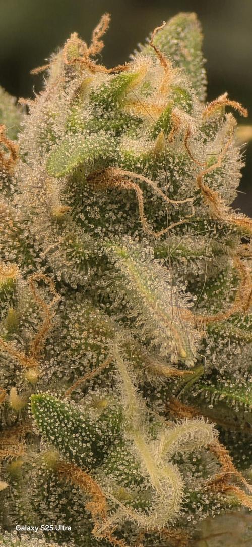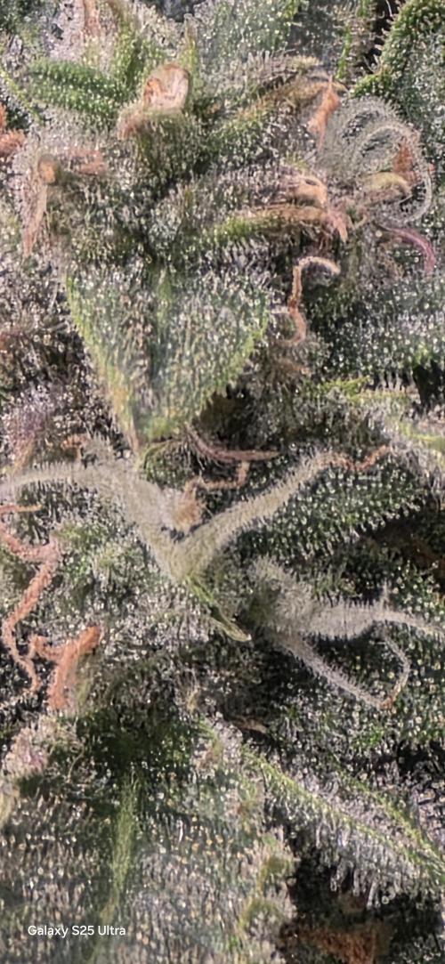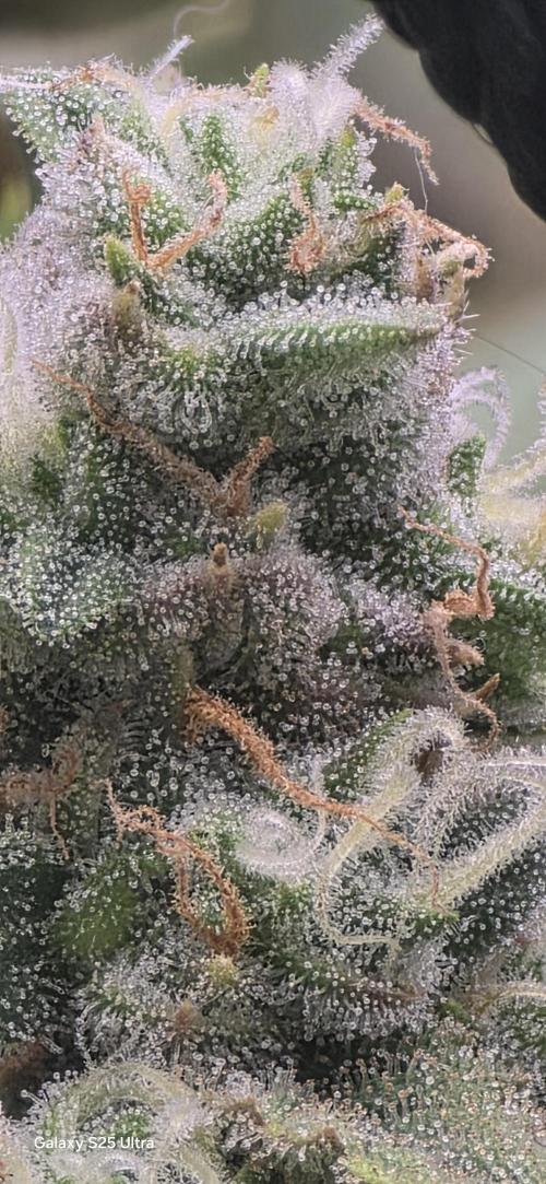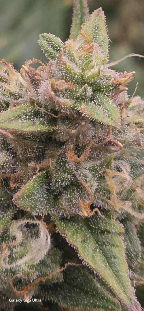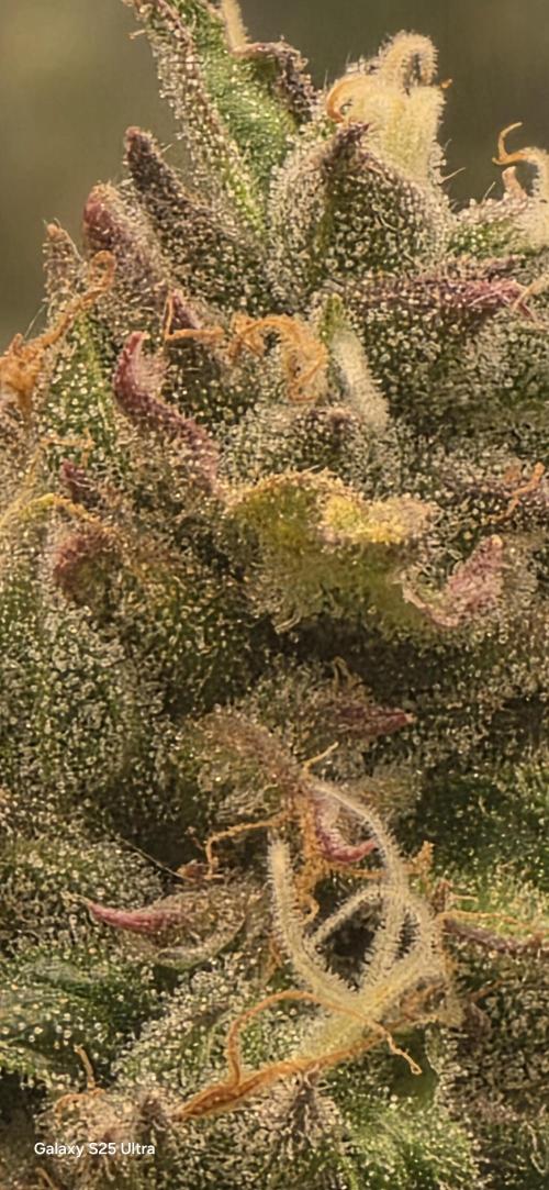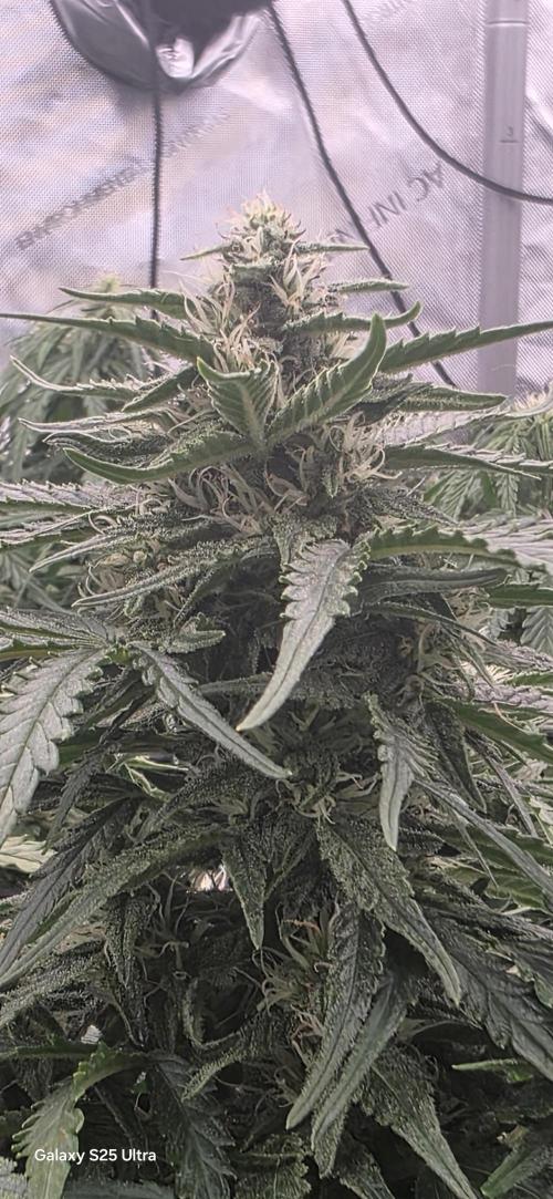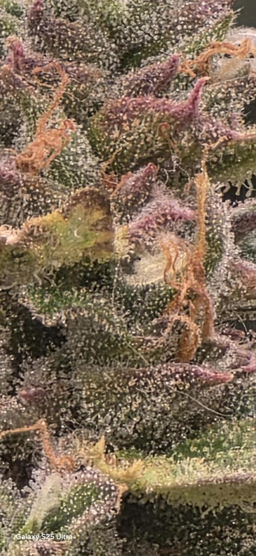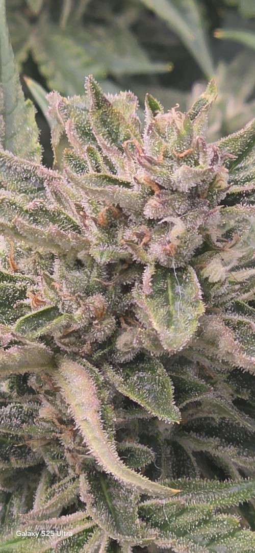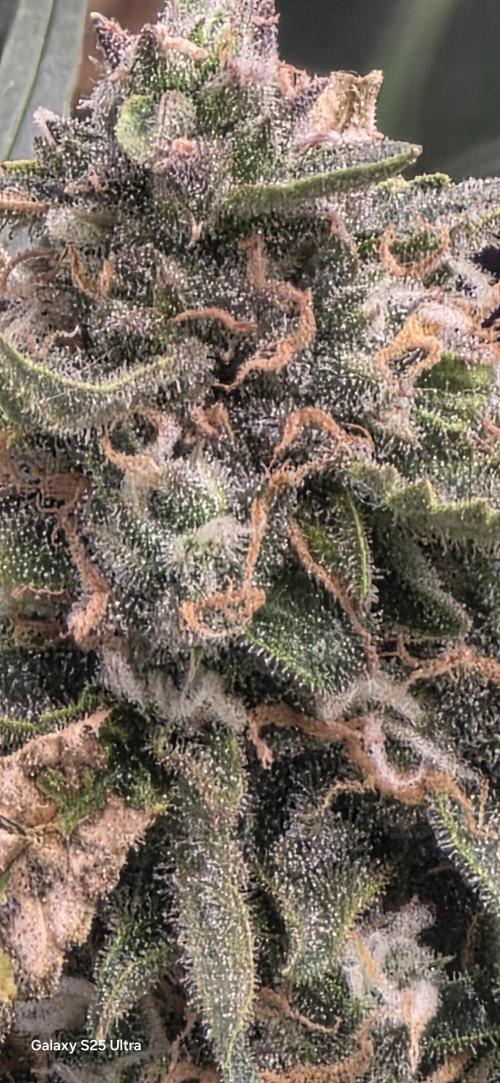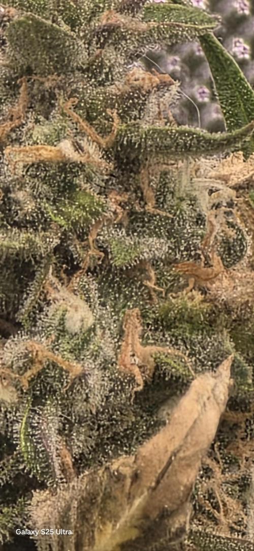 Plant 1 Harvest 11/10/25: - over 1kg wet weight - bag was overflowing and tipping off scales so no accurate reading. Got light burn but looks good, burnt older leafs tips, near the bud is fine. some pink has come out in it
