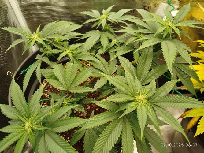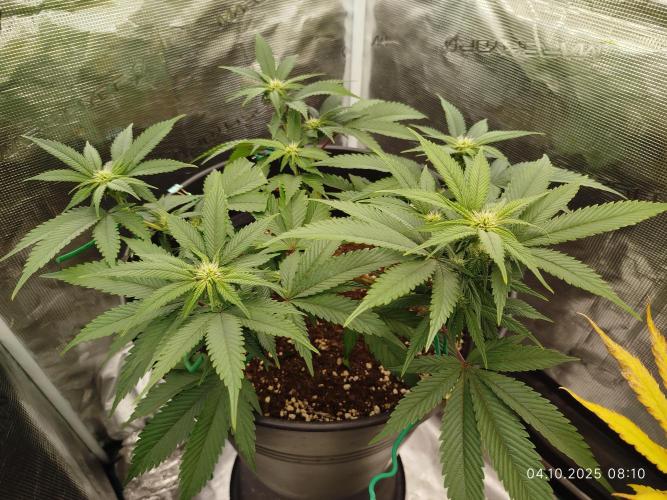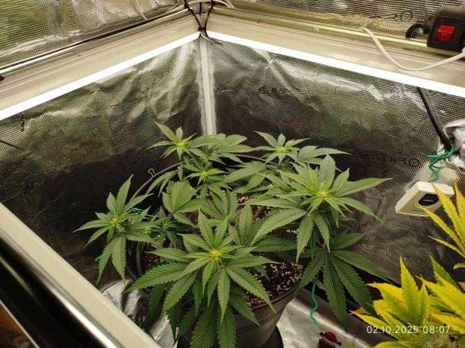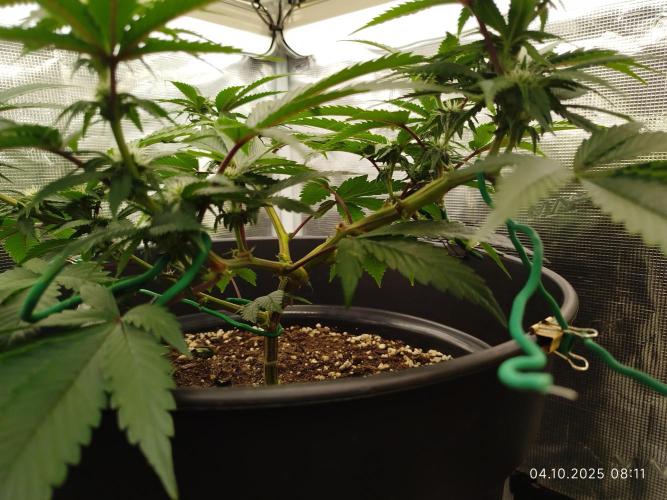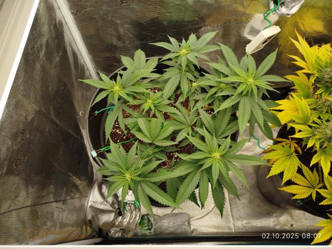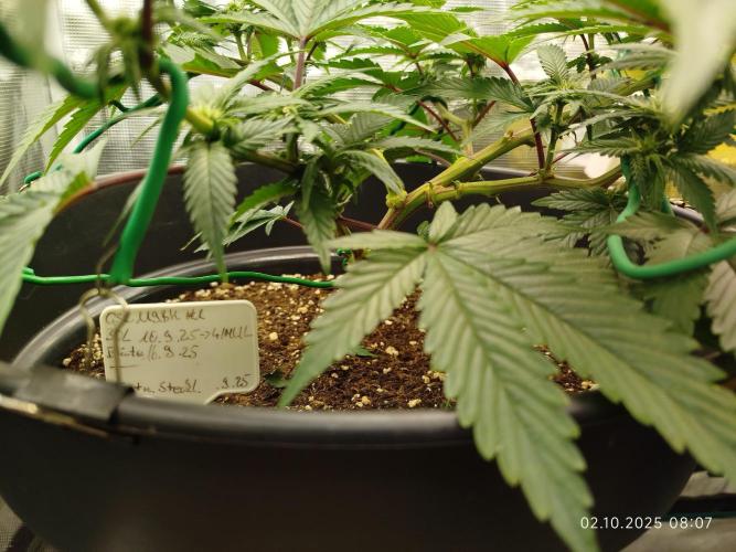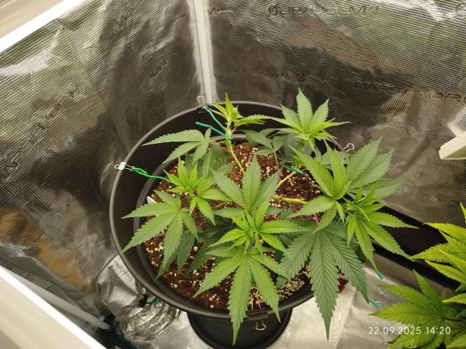 Big-Daddy Heute ist die Pflanze umgezogen. Sie hat einen Schuh á 30L bekommen. Zum angießen habe ich mit der vollen Dosis auf 1 L begonnen. 4 ml Bio Grow. Ich begründe es damit, das die Erde Wiederverwendung gefunden hat. Es ist keine frische Erde im Topf. Beim nächsten Gießen gibt es dann Hesi Power Zyme. Wegen des LST ist sie nun ganze zwei cm geschrumpft von zuletzt gemessen 20 cm auf 18 cm. Der Farbe nach zu urteilen, ist sie auf einem guten Weg. Lets Grow 15.9.25 Zweite Düngung mit Zugabe von Hesi Power Zyme. Diesmal im Verhältnis 3 ml/L Bio Grow, Sowie 1ml/L Hesi Power Zyme