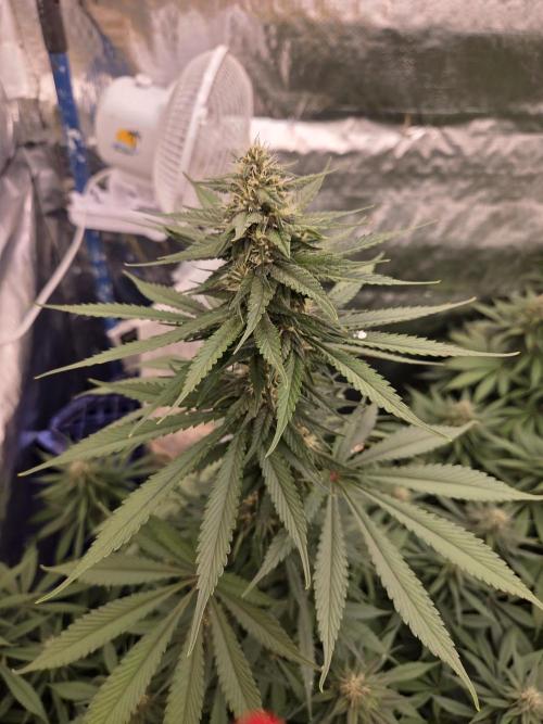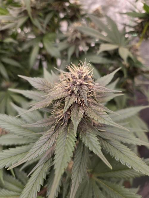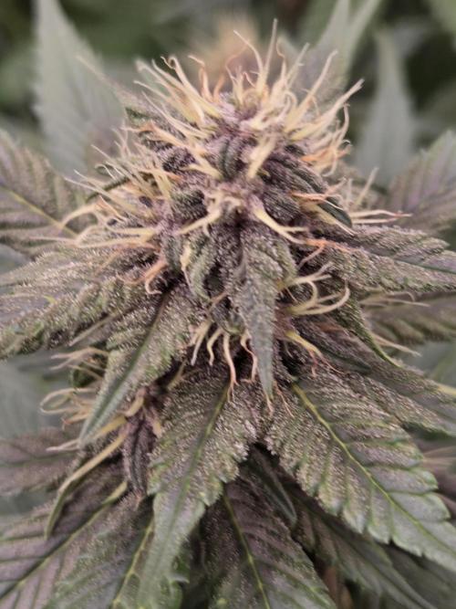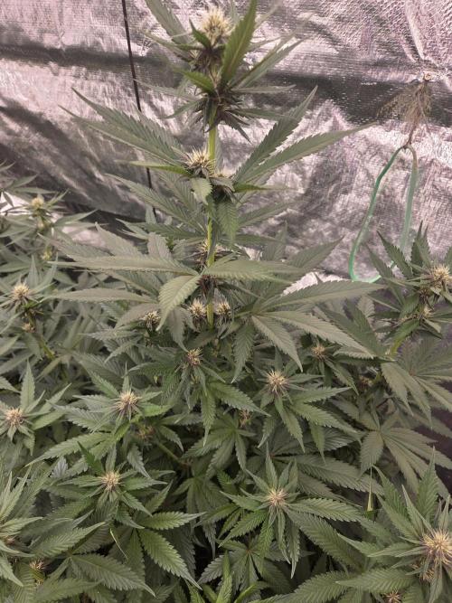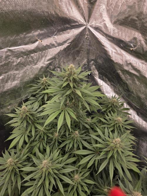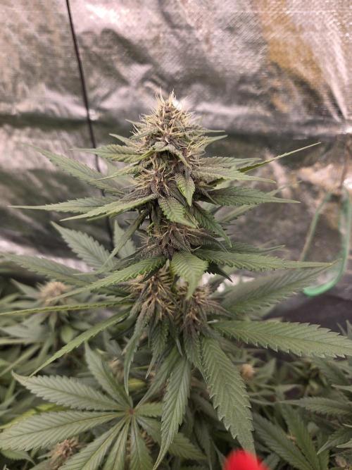 TooMuchTIm Cracking away now.. UVB up to 1.25hrs a day. Zero stress, just juicy, fat buds really starting to stack.. Unfortunately, while they are supposed to all be Purple genetics, it's only showing in 1 plant.. Anyone know if this is normal, or the result of clear bag seeds? Anyway, they're looking happy, healthy & dusted in sugar! Sweeeeet! Happy grows, everone!