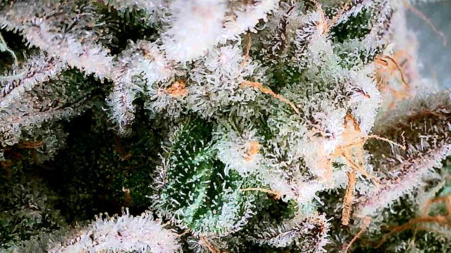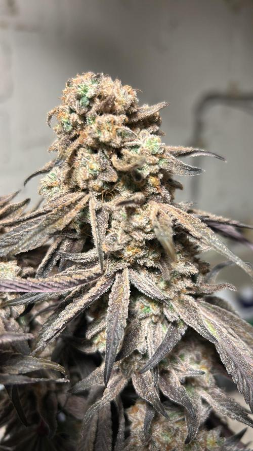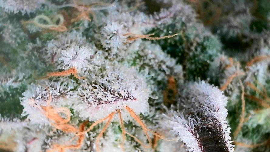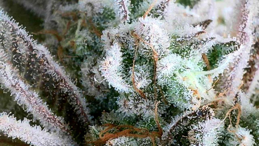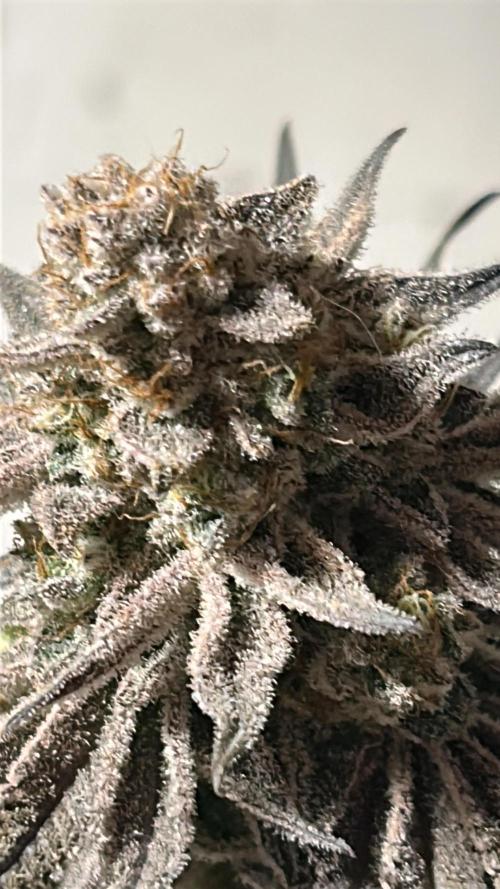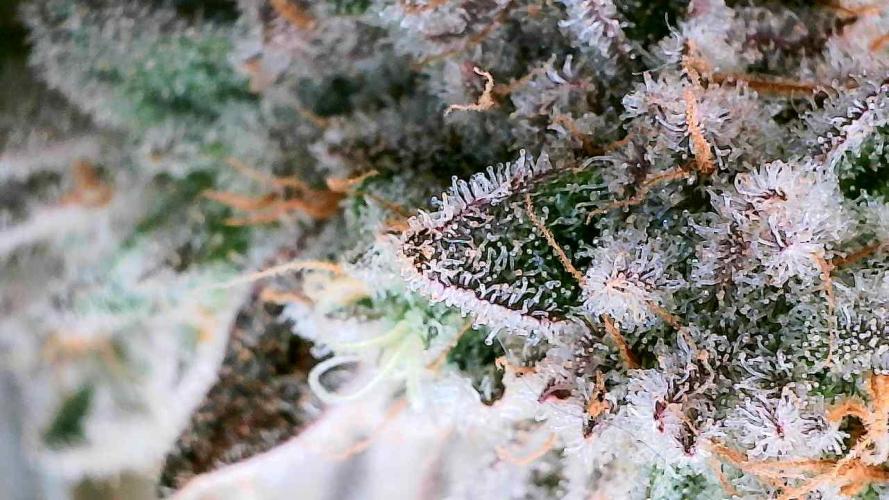 • Resin: Trichomes cover nearly all bud sites and sugar leaves, heavy frost ❄️